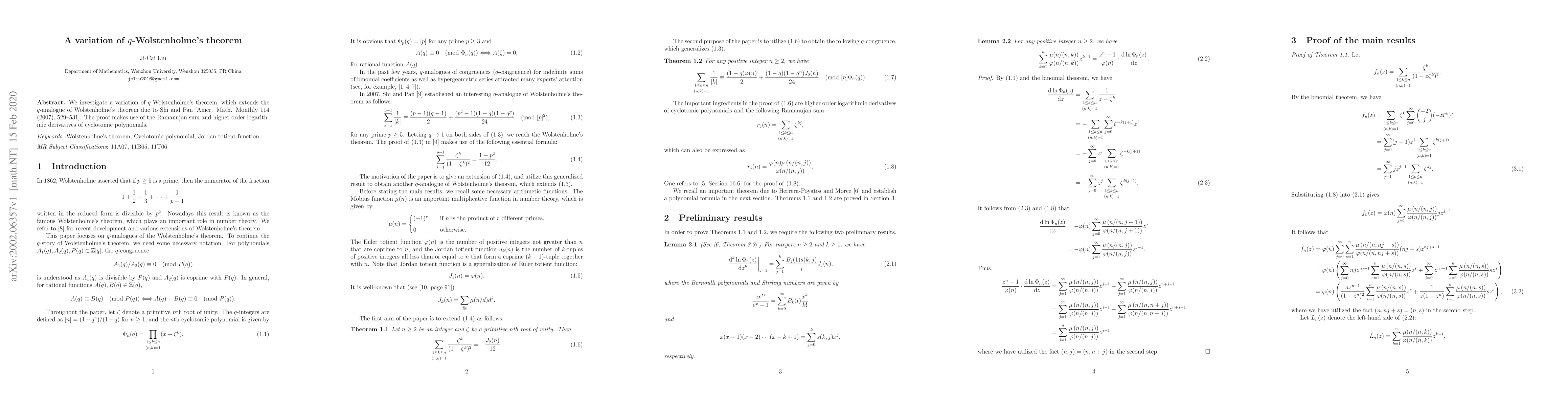 This paper explores a modified version of $q$-Wolstenholme's theorem, extending the $q$-analogue by Shi and Pan, with proofs utilizing Ramanujan sums and higher-order logarithmic derivatives of cyclotomic polynomials.