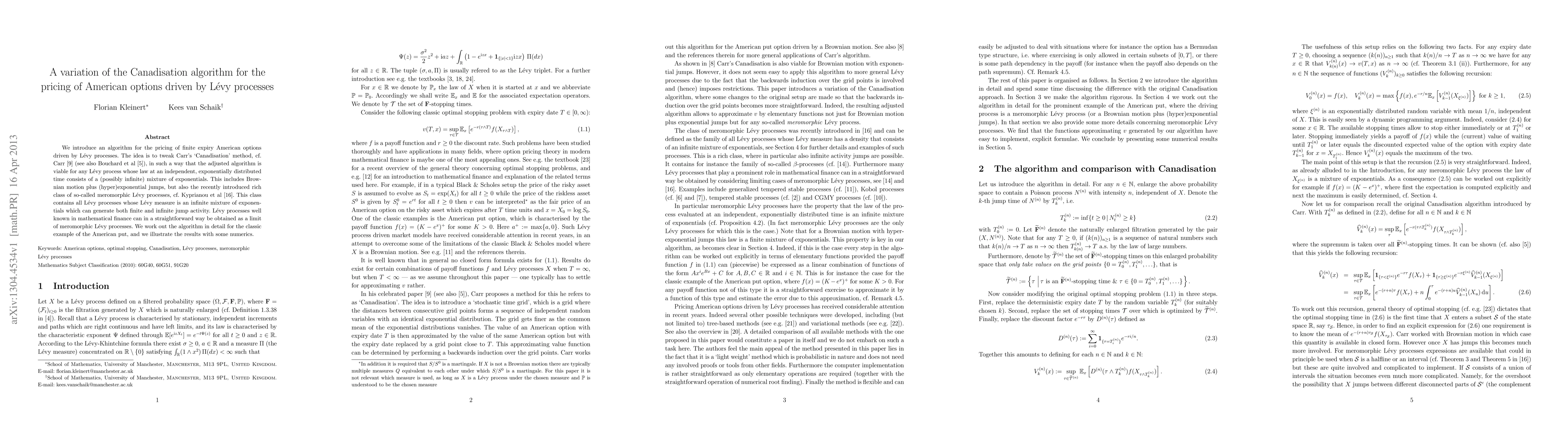 We introduce an algorithm for the pricing of finite expiry American options driven by L\'evy processes. The idea is to tweak Carr's `Canadisation' method, cf. Carr [9] (see also Bouchard et al [5]), in such a way that the adjusted algorithm is viable for any L\'evy process whose law at an independent, exponentially distributed time consists of a (possibly infinite) mixture of exponentials. This includes Brownian motion plus (hyper)exponential jumps, but also the recently introduced rich class of so-called meromorphic L\'evy processes, cf. Kyprianou et al [16]. This class contains all L\'evy processes whose L\'evy measure is an infinite mixture of exponentials which can generate both finite and infinite jump activity. L\'evy processes well known in mathematical finance can in a straightforward way be obtained as a limit of meromorphic L\'evy processes. We work out the algorithm in detail for the classic example of the American put, and we illustrate the results with some numerics.