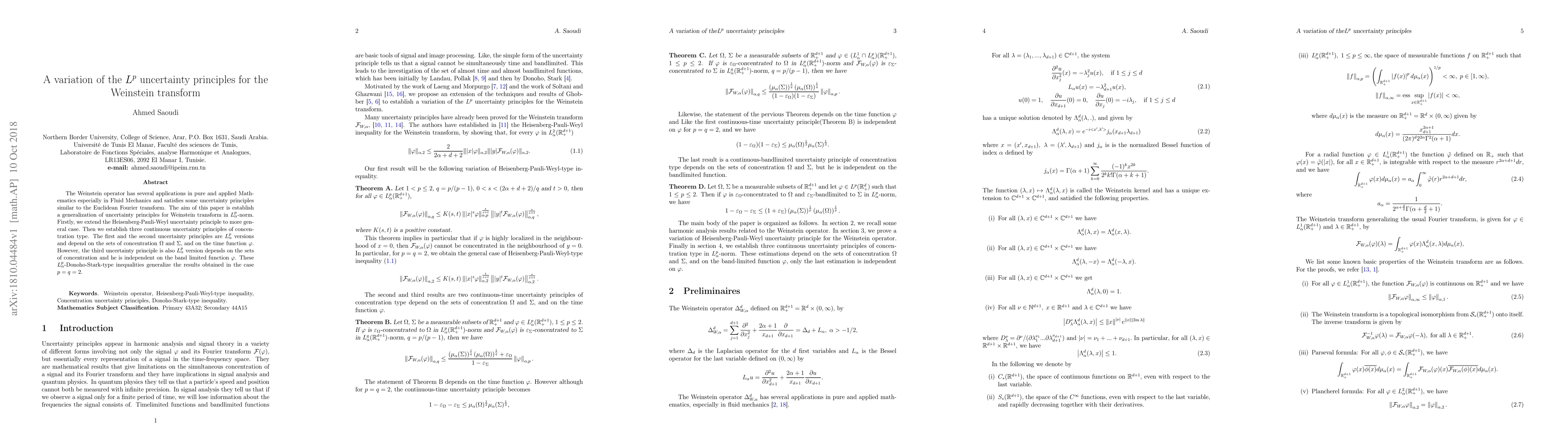 The Weinstein operator has several applications in pure and applied Mathematics especially in Fluid Mechanics and satisfies some uncertainty principles similar to the Euclidean Fourier transform. The aim of this paper is establish a generalization of uncertainty principles for Weinstein transform in $L_\alpha^p$-norm. Firstly, we extend the Heisenberg-Pauli-Weyl uncertainty principle to more general case. Then we establish three continuous uncertainty principles of concentration type. The first and the second uncertainty principles are $L_\alpha^p$ versions and depend on the sets of concentration $\Omega$ and $\Sigma$, and on the time function $\varphi$. However, the third uncertainty principle is also $L_\alpha^p$ version depends on the sets of concentration and he is independent on the band limited function $\varphi$. These $L_\alpha^p$-Donoho-Stark-type inequalities generalize the results obtained in the case $p=q=2$.