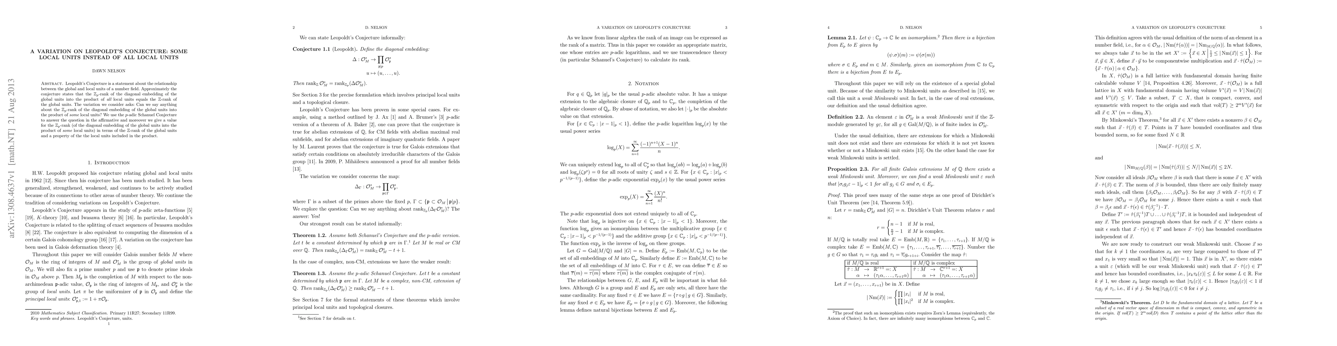 Leopoldt's Conjecture is a statement about the relationship between the global and local units of a number field. Approximately the conjecture states that the Z_p-rank of the diagonal embedding of the global units into the product of all local units equals the Z-rank of the global units. The variation we consider asks: Can we say anything about the Z_p-rank of the diagonal embedding of the global units into the product of some local units? We use the p-adic Schanuel Conjecture to answer the question in the affirmative and moreover we give a value for the Z_p-rank (of the diagonal embedding of the global units into the product of some local units) in terms of the Z-rank of the global units and a property of the the local units included in the product.