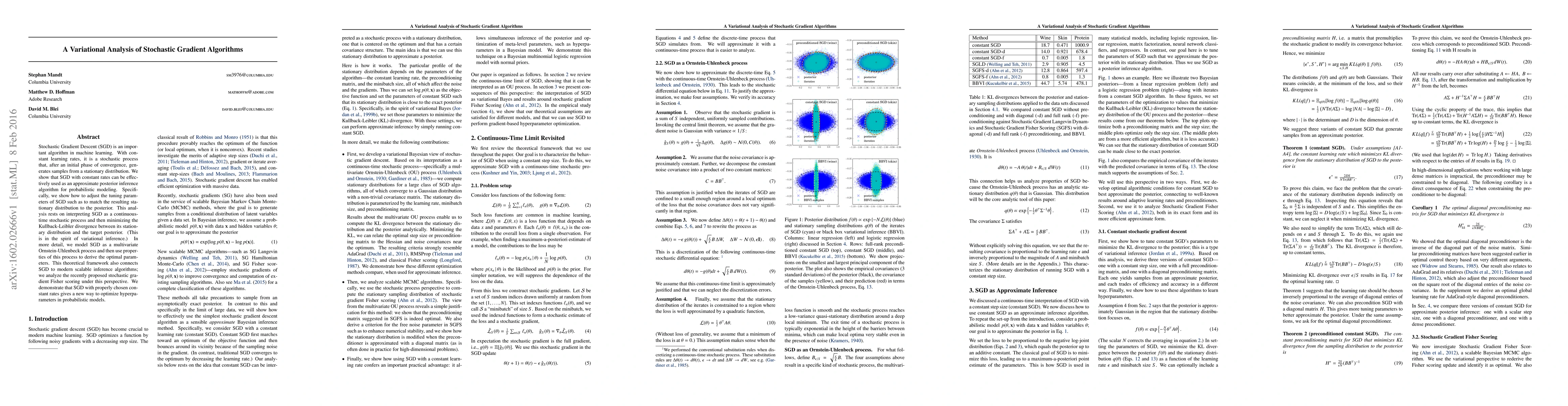 Stochastic Gradient Descent (SGD) is an important algorithm in machine learning. With constant learning rates, it is a stochastic process that, after an initial phase of convergence, generates samples from a stationary distribution. We show that SGD with constant rates can be effectively used as an approximate posterior inference algorithm for probabilistic modeling. Specifically, we show how to adjust the tuning parameters of SGD such as to match the resulting stationary distribution to the posterior. This analysis rests on interpreting SGD as a continuous-time stochastic process and then minimizing the Kullback-Leibler divergence between its stationary distribution and the target posterior. (This is in the spirit of variational inference.) In more detail, we model SGD as a multivariate Ornstein-Uhlenbeck process and then use properties of this process to derive the optimal parameters. This theoretical framework also connects SGD to modern scalable inference algorithms; we analyze the recently proposed stochastic gradient Fisher scoring under this perspective. We demonstrate that SGD with properly chosen constant rates gives a new way to optimize hyperparameters in probabilistic models.