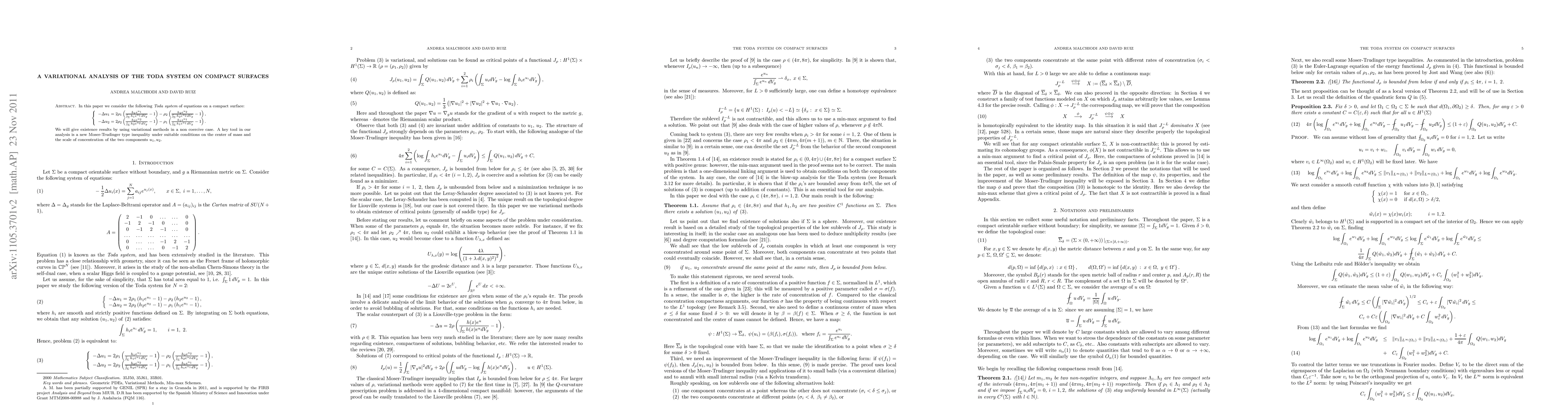 In this paper we consider the Toda system of equations on a compact surface. We will give existence results by using variational methods in a non coercive case. A key tool in our analysis is a new Moser-Trudinger type inequality under suitable conditions on the center of mass and the scale of concentration of the two components u_1, u_2.