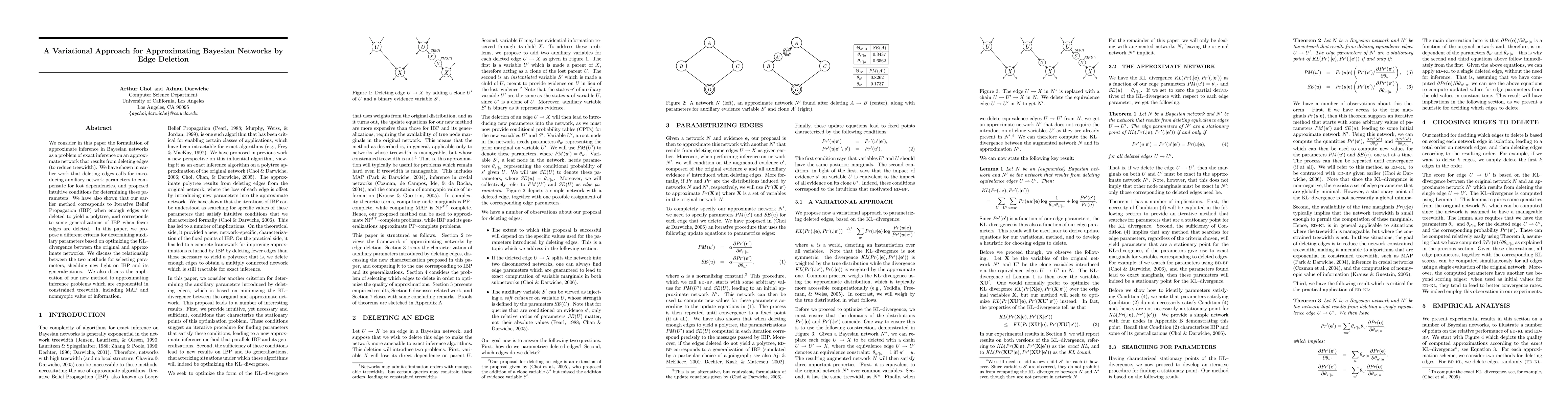 We consider in this paper the formulation of approximate inference in Bayesian networks as a problem of exact inference on an approximate network that results from deleting edges (to reduce treewidth). We have shown in earlier work that deleting edges calls for introducing auxiliary network parameters to compensate for lost dependencies, and proposed intuitive conditions for determining these parameters. We have also shown that our method corresponds to IBP when enough edges are deleted to yield a polytree, and corresponds to some generalizations of IBP when fewer edges are deleted. In this paper, we propose a different criteria for determining auxiliary parameters based on optimizing the KL-divergence between the original and approximate networks. We discuss the relationship between the two methods for selecting parameters, shedding new light on IBP and its generalizations. We also discuss the application of our new method to approximating inference problems which are exponential in constrained treewidth, including MAP and nonmyopic value of information.