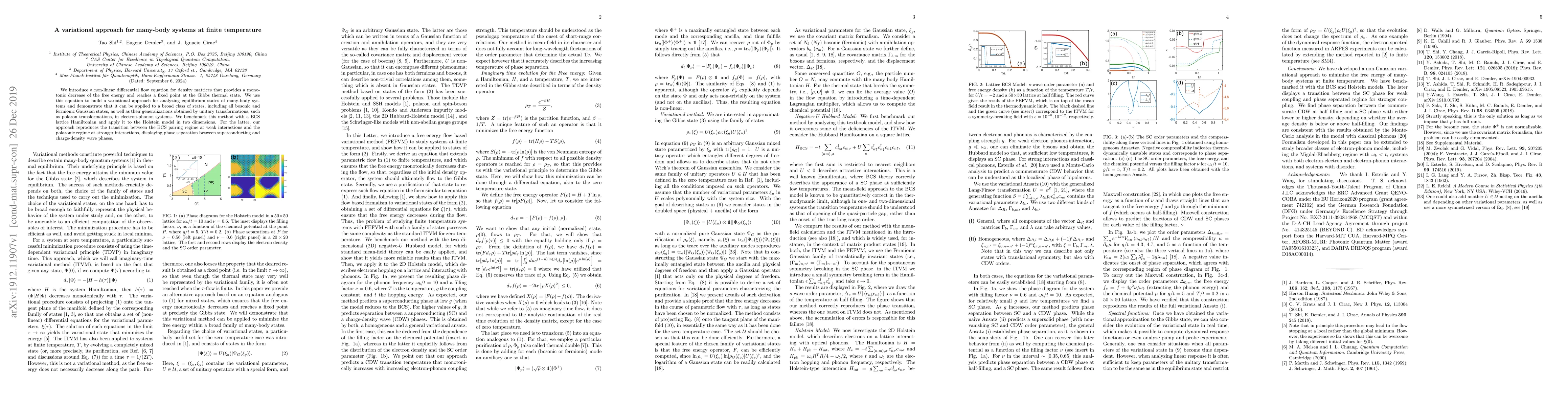 This paper proposes a variational approach using a non-linear differential flow equation for density matrices to analyze equilibrium states in many-body systems at finite temperature, achieving a monotonic decrease in free energy. The method is demonstrated to be effective for various bosonic and fermionic Gaussian states and their transformations, as shown through applications to BCS lattice and Holstein models.