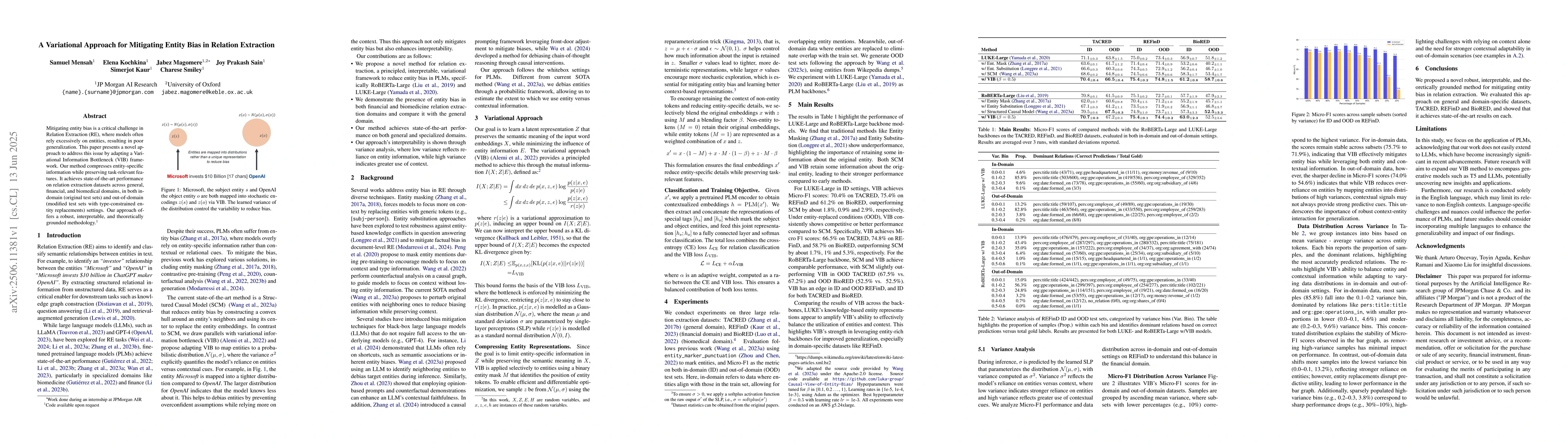 Mitigating entity bias is a critical challenge in Relation Extraction (RE), where models often rely excessively on entities, resulting in poor generalization. This paper presents a novel approach to address this issue by adapting a Variational Information Bottleneck (VIB) framework. Our method compresses entity-specific information while preserving task-relevant features. It achieves state-of-the-art performance on relation extraction datasets across general, financial, and biomedical domains, in both indomain (original test sets) and out-of-domain (modified test sets with type-constrained entity replacements) settings. Our approach offers a robust, interpretable, and theoretically grounded methodology.
