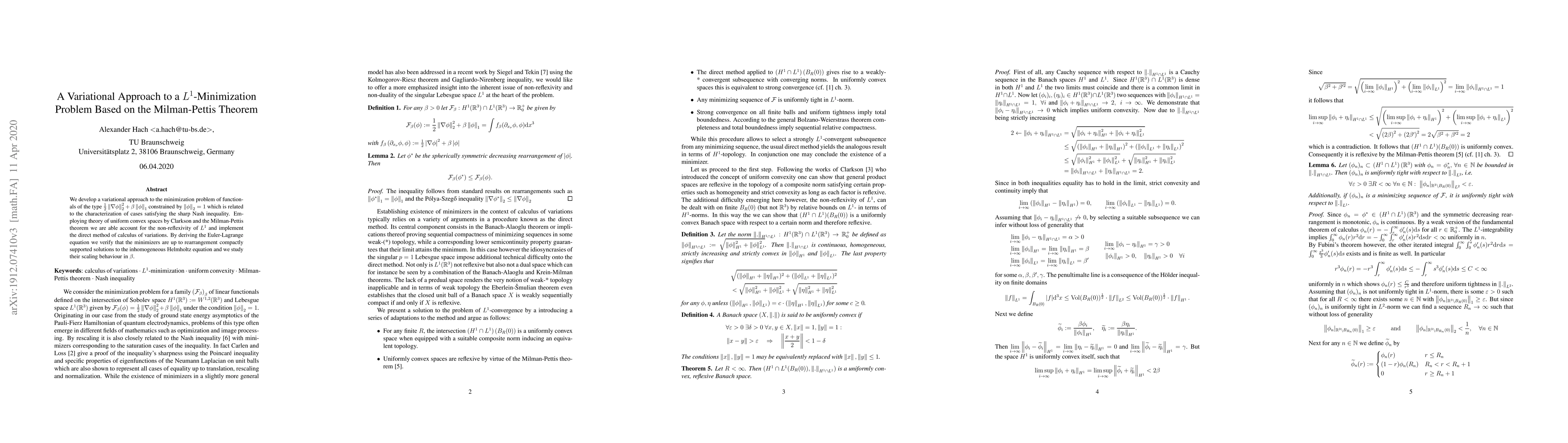 Researchers develop a new approach to solving an $L^1$ minimization problem using variational methods and the Milman-Pettis theorem, finding that minimizers scale with parameter $eta$.