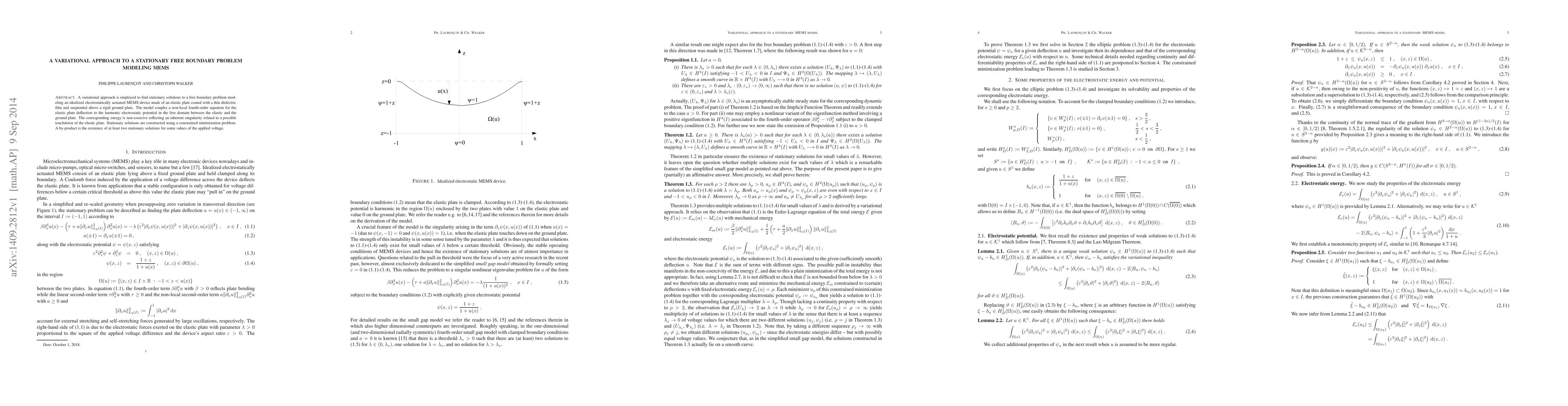 This paper uses a variational approach to find stationary solutions for a free boundary problem in electrostatically actuated MEMS devices. It models an elastic plate with a dielectric film suspended above a rigid plate, coupling the plate's deflection with the electrostatic potential, and demonstrates the existence of at least two stationary solutions for certain voltages.