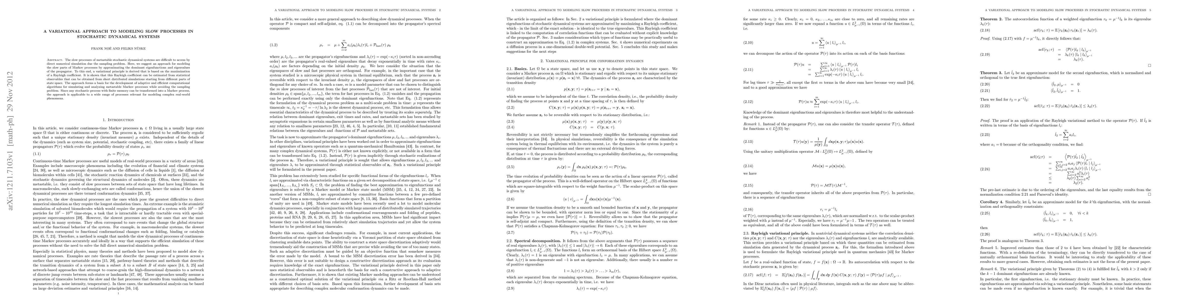 This paper proposes a variational method to model slow processes in metastable stochastic dynamical systems by approximating dominant eigenfunctions and eigenvalues of the propagator. The method uses a Rayleigh coefficient maximization and can be estimated from short simulations, offering an efficient way to simulate and analyze such processes while circumventing the sampling problem.