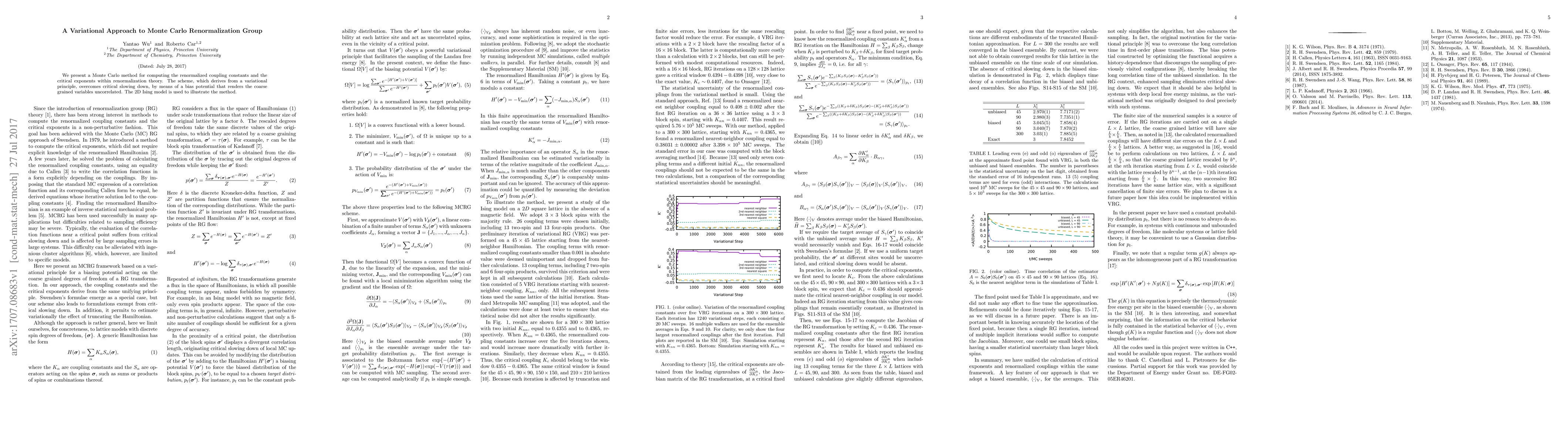 We present a Monte Carlo method for computing the renormalized coupling constants and the critical exponents within renormalization theory. The scheme, which derives from a variational principle, overcomes critical slowing down, by means of a bias potential that renders the coarse grained variables uncorrelated. The 2D Ising model is used to illustrate the method.