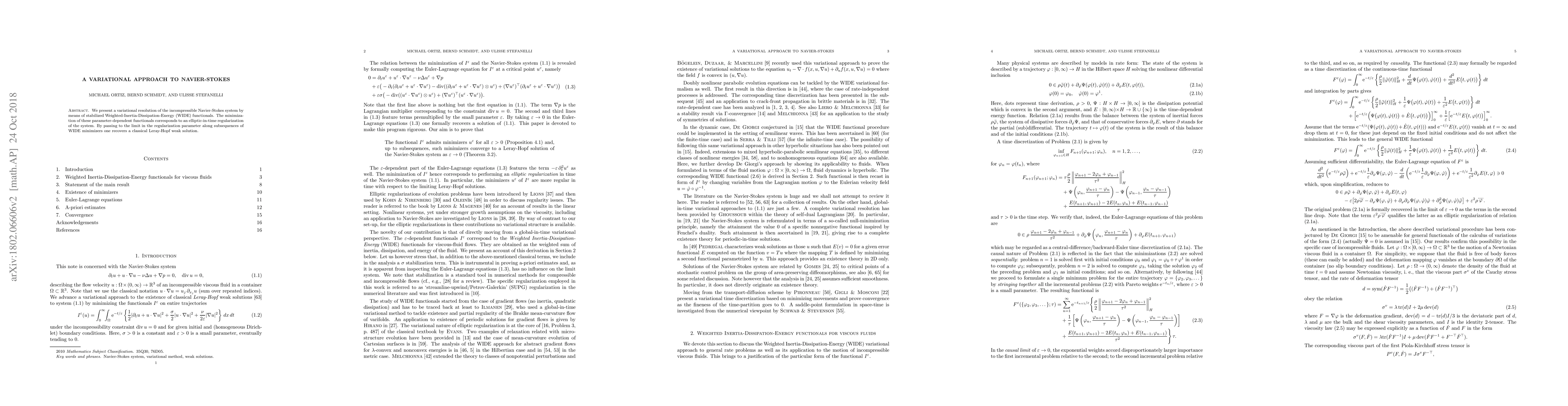 This paper proposes a variational method to solve the incompressible Navier-Stokes equations using stabilized WIDE functionals, which regularize the system. The limit of these functionals recovers a classical Leray-Hopf weak solution.