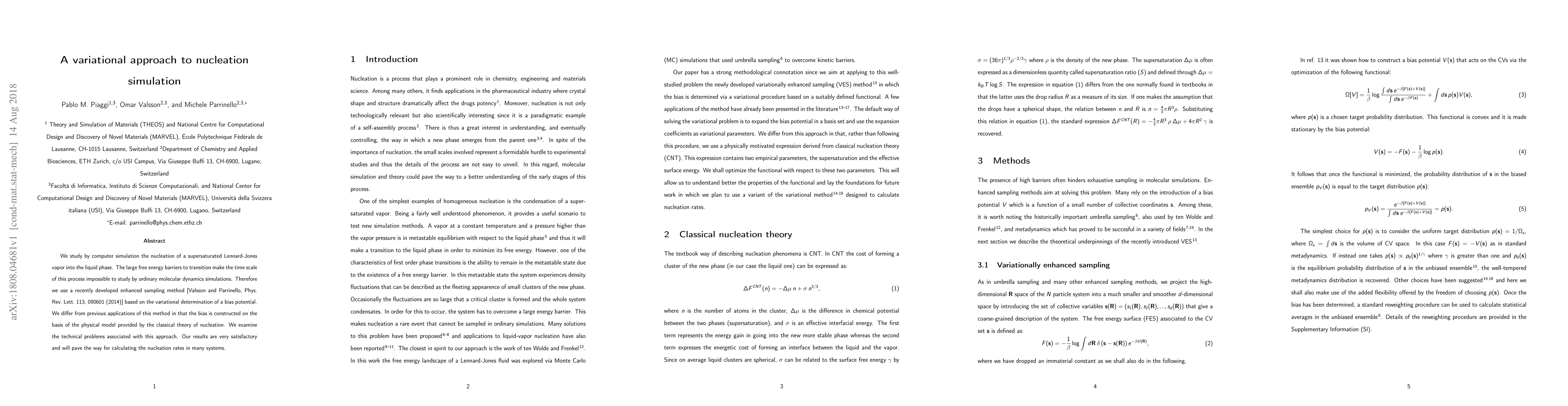 We study by computer simulation the nucleation of a supersaturated Lennard-Jones vapor into the liquid phase. The large free energy barriers to transition make the time scale of this process impossible to study by ordinary molecular dynamics simulations.Therefore we use a recently developed enhanced sampling method [Valsson and Parrinello, Phys. Rev. Lett. 113, 090601 (2014)] based on the variational determination of a bias potential. We differ from previous applications of this method in that the bias is constructed on the basis of the physical model provided by the classical theory of nucleation. We examine the technical problems associated with this approach. Our results are very satisfactory and will pave the way for calculating the nucleation rates in many systems.
