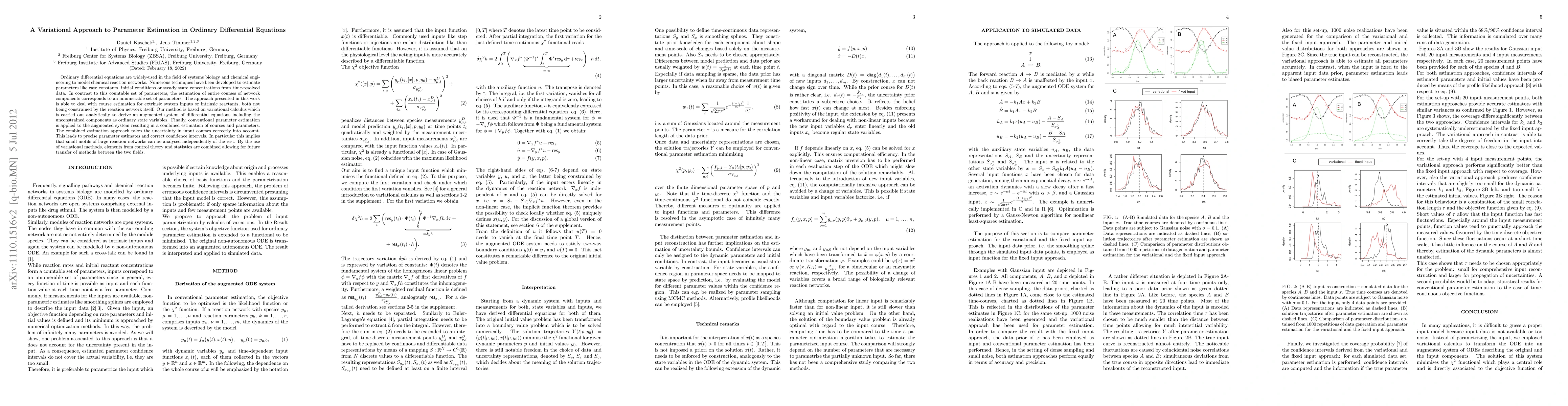 Ordinary differential equations are widely-used in the field of systems biology and chemical engineering to model chemical reaction networks. Numerous techniques have been developed to estimate parameters like rate constants, initial conditions or steady state concentrations from time-resolved data. In contrast to this countable set of parameters, the estimation of entire courses of network components corresponds to an innumerable set of parameters. The approach presented in this work is able to deal with course estimation for extrinsic system inputs or intrinsic reactants, both not being constrained by the reaction network itself. Our method is based on variational calculus which is carried out analytically to derive an augmented system of differential equations including the unconstrained components as ordinary state variables. Finally, conventional parameter estimation is applied to the augmented system resulting in a combined estimation of courses and parameters. The combined estimation approach takes the uncertainty in input courses correctly into account. This leads to precise parameter estimates and correct confidence intervals. In particular this implies that small motifs of large reaction networks can be analysed independently of the rest. By the use of variational methods, elements from control theory and statistics are combined allowing for future transfer of methods between the two fields.