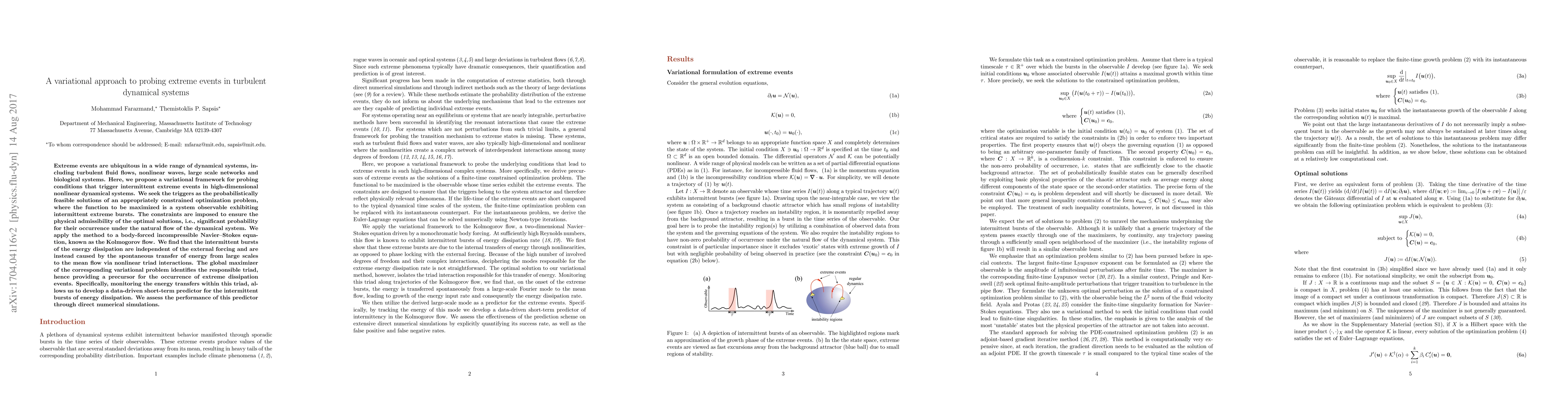 This paper proposes a variational framework to identify conditions triggering extreme events in turbulent dynamical systems, applying it to the Kolmogorov flow. The method reveals that intermittent bursts of energy dissipation are driven by spontaneous energy transfers via nonlinear triad interactions, providing a predictor for such events.