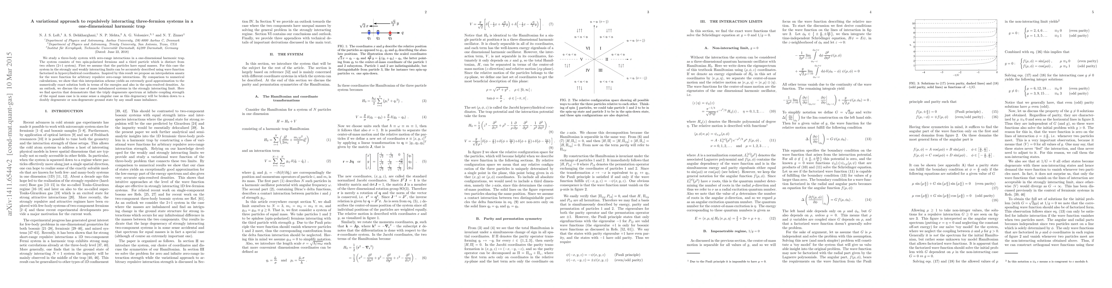 We study a three-body system with zero-range interactions in a one-dimensional harmonic trap. The system consists of two spin-polarized fermions and a third particle which is distinct from two others (2+1 system). First we assume that the particles have equal masses. For this case the system in the strongly and weakly interacting limits can be accurately described using wave function factorized in hyperspherical coordinates. Inspired by this result we propose an interpolation ansatz for the wave function for arbitrary repulsive zero-range interactions. By comparison to numerical calculations, we show that this interpolation scheme yields an extremely good approximation to the numerically exact solution both in terms of the energies and also in the spin-resolved densities. As an outlook, we discuss the case of mass imbalanced systems in the strongly interacting limit. Here we find spectra that demonstrate that the triply degenerate spectrum at infinite coupling strength of the equal mass case is in some sense a singular case as this degeneracy will be broken down to a doubly degenerate or non-degenerate ground state by any small mass imbalance.