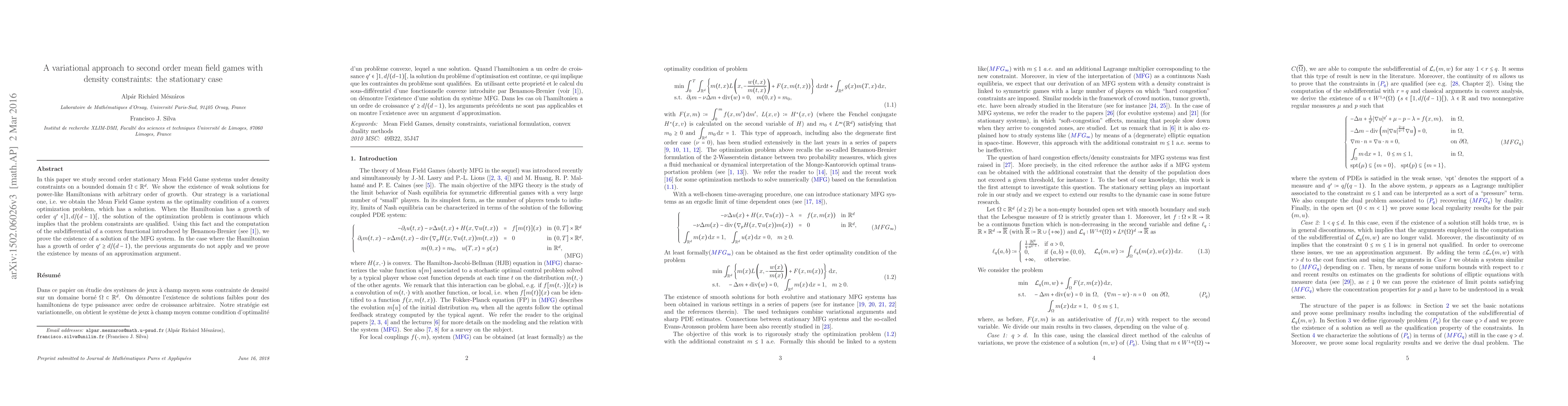 This paper explores second order stationary Mean Field Game systems with density constraints, proving the existence of weak solutions via variational methods. For Hamiltonians with growth orders between 1 and d/(d-1), continuity of the optimization solution ensures the qualification of problem constraints, while an approximation argument is used for higher growth orders.