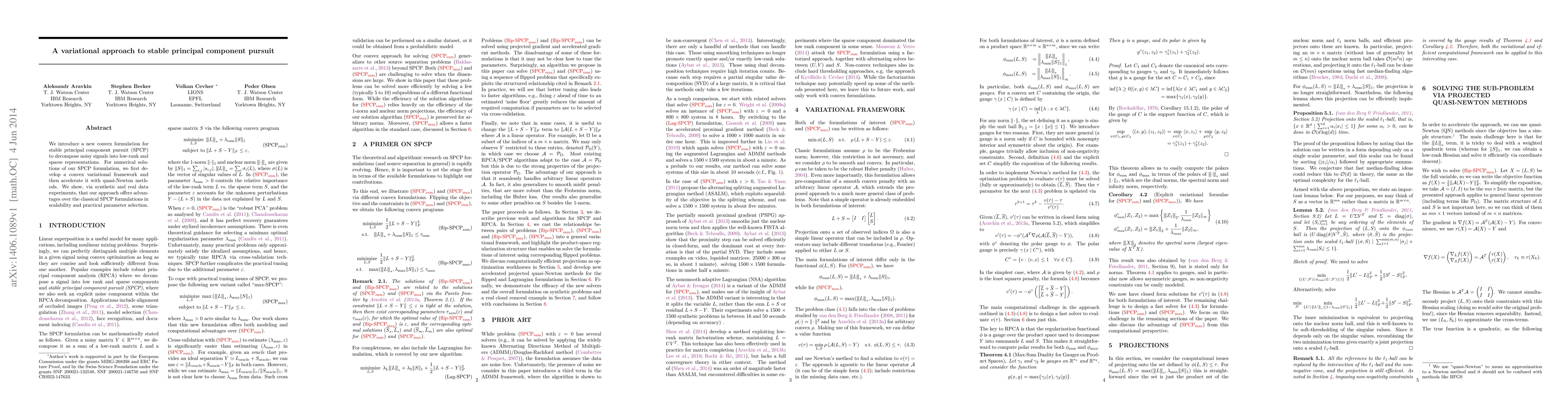 This paper proposes a new convex formulation for stable principal component pursuit (SPCP) to decompose noisy signals into low-rank and sparse components. The authors develop a convex variational framework and accelerate it using quasi-Newton methods, demonstrating improved scalability and parameter selection compared to classical SPCP methods through synthetic and real data experiments.