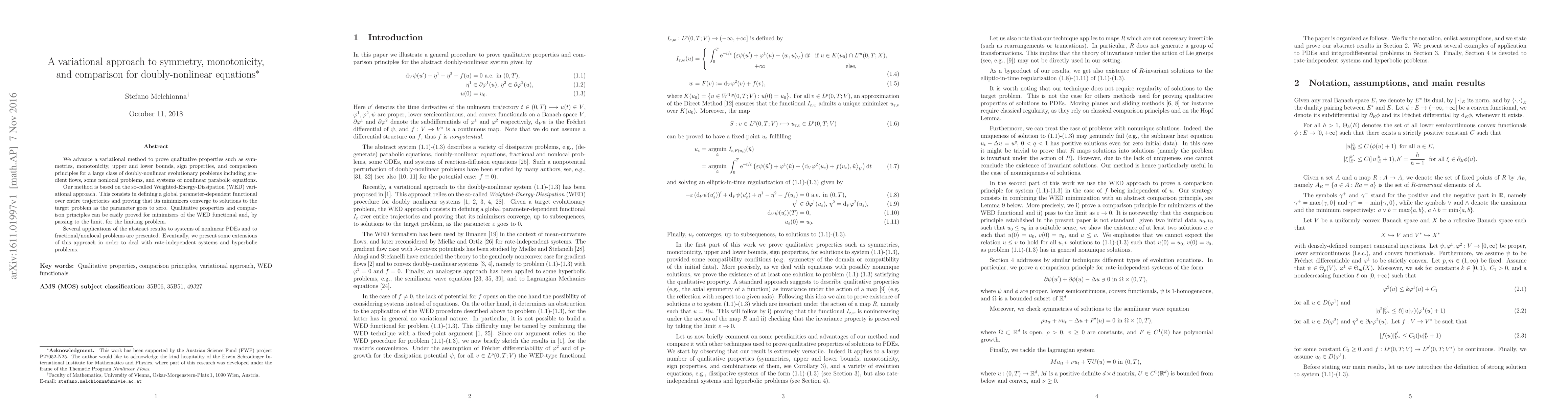 This paper introduces a variational method based on the Weighted-Energy-Dissipation (WED) approach to establish symmetries, monotonicity, and comparison principles for doubly-nonlinear evolutionary problems, including gradient flows and nonlocal systems. The method leverages a global functional to prove qualitative properties and comparison principles for solutions.