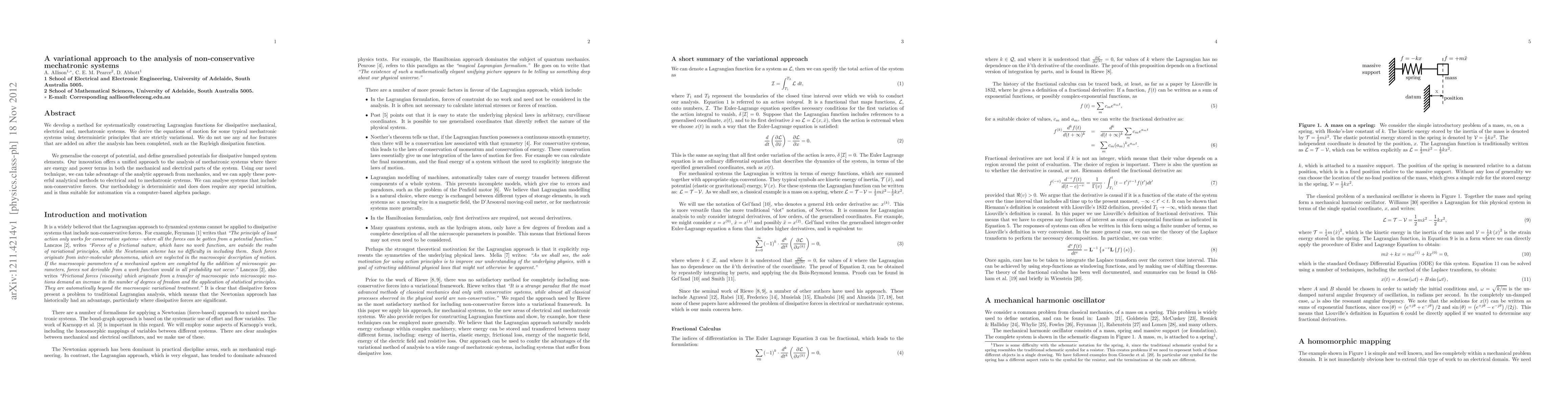 We develop a method for systematically constructing Lagrangian functions for dissipative mechanical, electrical and, mechatronic systems. We derive the equations of motion for some typical mechatronic systems using deterministic principles that are strictly variational. We do not use any ad hoc features that are added on after the analysis has been completed, such as the Rayleigh dissipation function. We generalise the concept of potential, and define generalised potentials for dissipative lumped system elements. Our innovation offers a unified approach to the analysis of mechatronic systems where there are energy and power terms in both the mechanical and electrical parts of the system. Using our novel technique, we can take advantage of the analytic approach from mechanics, and we can apply these pow- erful analytical methods to electrical and to mechatronic systems. We can analyse systems that include non-conservative forces. Our methodology is deterministic and does does require any special intuition, and is thus suitable for automation via a computer-based algebra package.