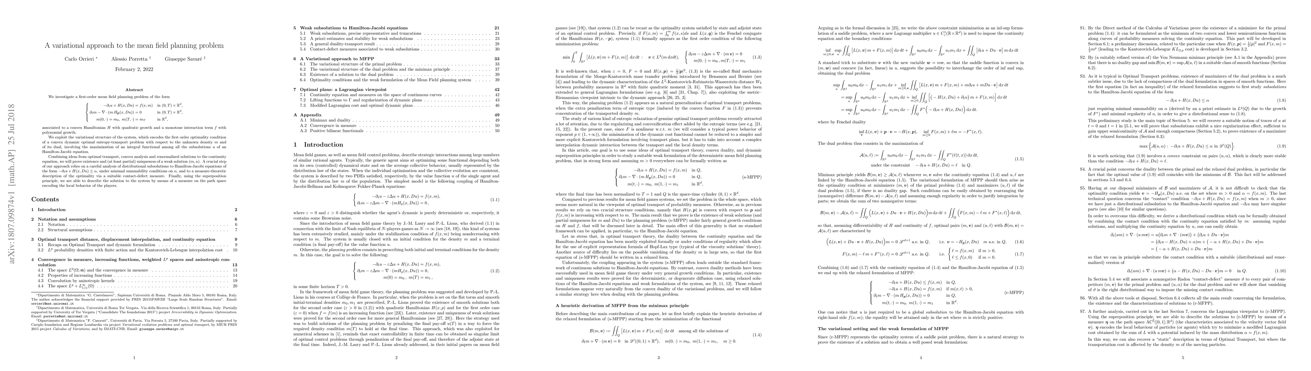 We investigate a first-order mean field planning problem of the form \begin{equation} \left\lbrace\begin{aligned} -\partial_t u + H(x,Du) &= f(x,m) &&\text{in } (0,T)\times \mathbb{R}^d, \\ \partial_t m - \nabla\cdot (m\,H_p(x,Du)) &= 0 &&\text{in }(0,T)\times \mathbb{R}^d,\\ m(0,\cdot) = m_0, \; m(T,\cdot) &= m_T &&\text{in } \mathbb{R}^d, \end{aligned}\right. \end{equation} associated to a convex Hamiltonian $H$ with quadratic growth and a monotone interaction term $f$ with polynomial growth. We exploit the variational structure of the system, which encodes the first order optimality condition of a convex dynamic optimal entropy-transport problem with respect to the unknown density $m$ and of its dual, involving the maximization of an integral functional among all the subsolutions $u$ of an Hamilton-Jacobi equation. Combining ideas from optimal transport, convex analysis and renormalized solutions to the continuity equation, we will prove existence and (at least partial) uniqueness of a weak solution $(m,u)$. A crucial step of our approach relies on a careful analysis of distributional subsolutions to Hamilton-Jacobi equations of the form $-\partial_t u + H(x,Du) \leq \alpha$, under minimal summability conditions on $\alpha$, and to a measure-theoretic description of the optimality via a suitable contact-defect measure. Finally, using the superposition principle, we are able to describe the solution to the system by means of a measure on the path space encoding the local behavior of the players.