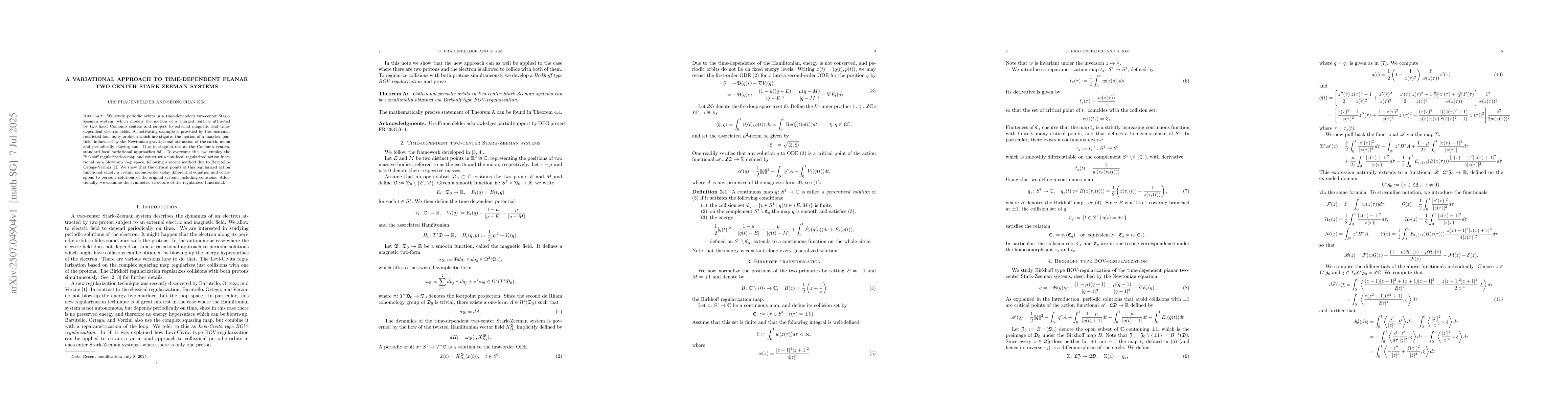 We study periodic orbits in a time-dependent two-center Stark-Zeeman system, which models the motion of a charged particle attracted by two fixed Coulomb centers and subject to external magnetic and time-dependent electric fields. A motivating example is provided by the bicircular restricted four-body problem which investigates the motion of a massless particle, influenced by the Newtonian gravitational attraction of the earth, moon and periodically moving sun. Due to singularities at the Coulomb centers, standard local variational approaches fail. To overcome this, we employ the Birkhoff regularization map and construct a non-local regularized action functional on a blown-up loop space, following a recent method due to Barutello-Ortega-Vernizi \cite{BOV21}. We show that the critical points of this regularized action functional satisfy a certain second-order delay differential equation and correspond to periodic solutions of the original system, including collisions. Additionally, we examine the symmetric structure of the regularized functional.