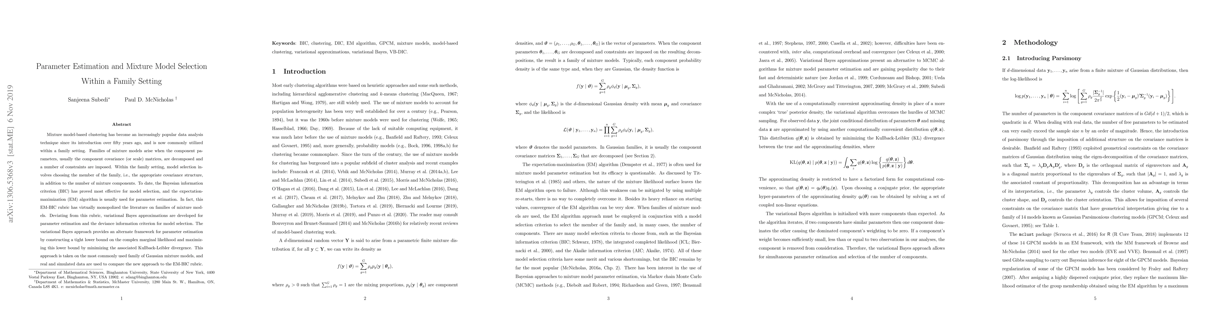 This paper proposes a new variational Bayes approximations-DIC rubric for parameter estimation and mixture model selection in family settings, contrasting with the traditional EM-BIC approach. It evaluates the effectiveness of this new method using real and simulated data.