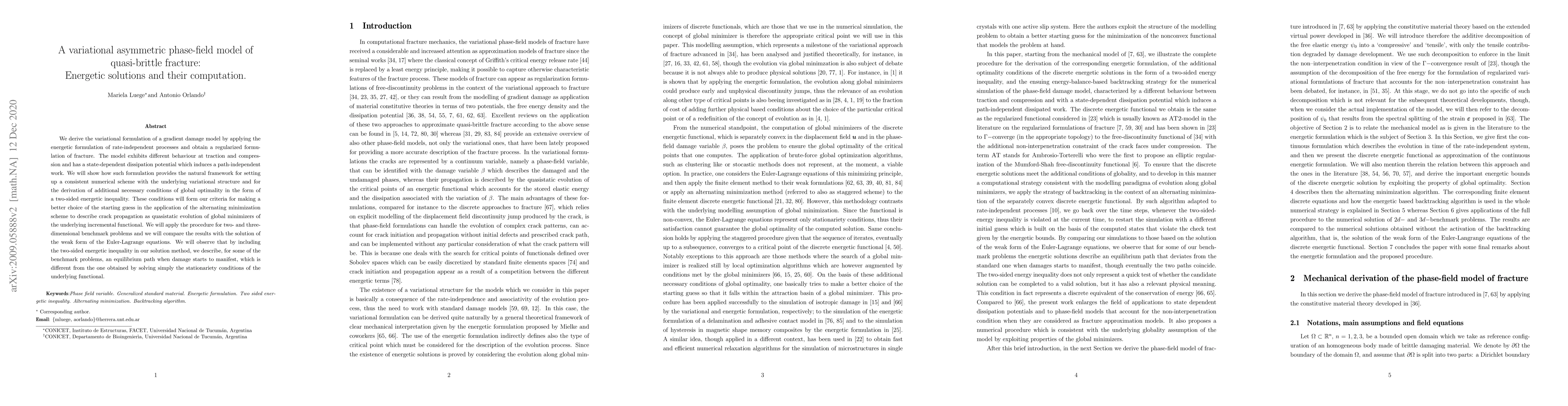 We derive the variational formulation of a gradient damage model by applying the energetic formulation of rate-independent processes and obtain a regularized formulation of fracture. The model exhibits different behavior at traction and compression and has a state-dependent dissipation potential which induces a path-independent work. We will show how such formulation provides the natural framework for setting up a consistent numerical scheme with the underlying variational structure and for the derivation of additional necessary conditions of global optimality in the form of a two-sided energetic inequality. These conditions will form our criteria for making a better choice of the starting guess in the application of the alternating minimization scheme to describe crack propagation as quasistatic evolution of global minimizers of the underlying incremental functional. We will apply the procedure for two- and three-dimensional benchmark problems and we will compare the results with the solution of the weak form of the Euler-Lagrange equations. We will observe that by including the two-sided energetic inequality in our solution method, we describe, for some of the benchmark problems, an equilibrium path when the damage starts to manifest, which is different from the one obtained by solving simply the stationarity conditions of the underlying functional.