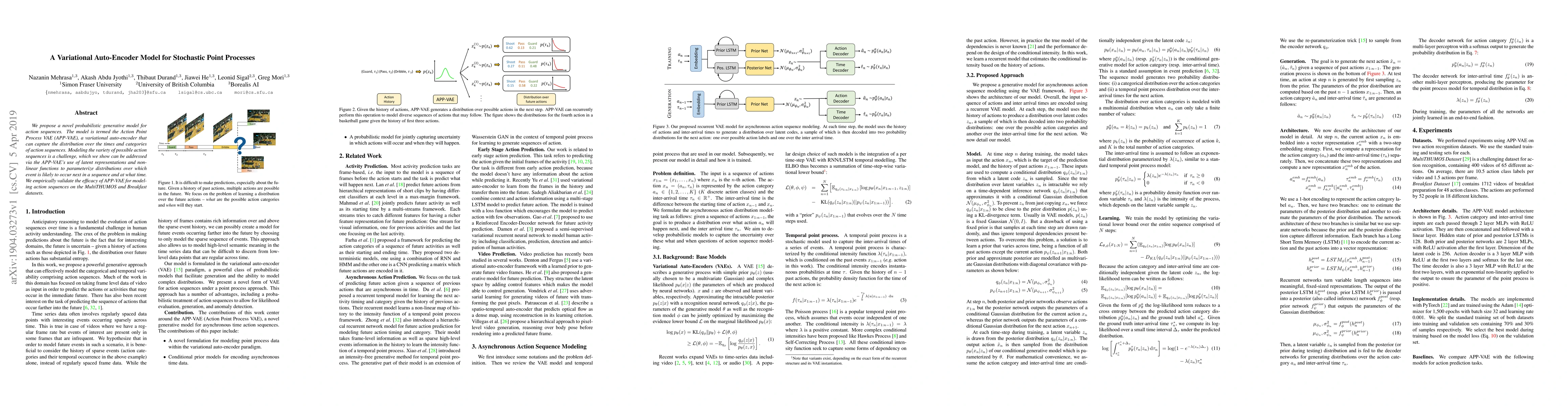 The paper introduces the Action Point Process VAE (APP-VAE), a variational auto-encoder designed to model the distribution of action sequences, capturing both time and category of actions. The model's effectiveness is validated on the MultiTHUMOS and Breakfast datasets.