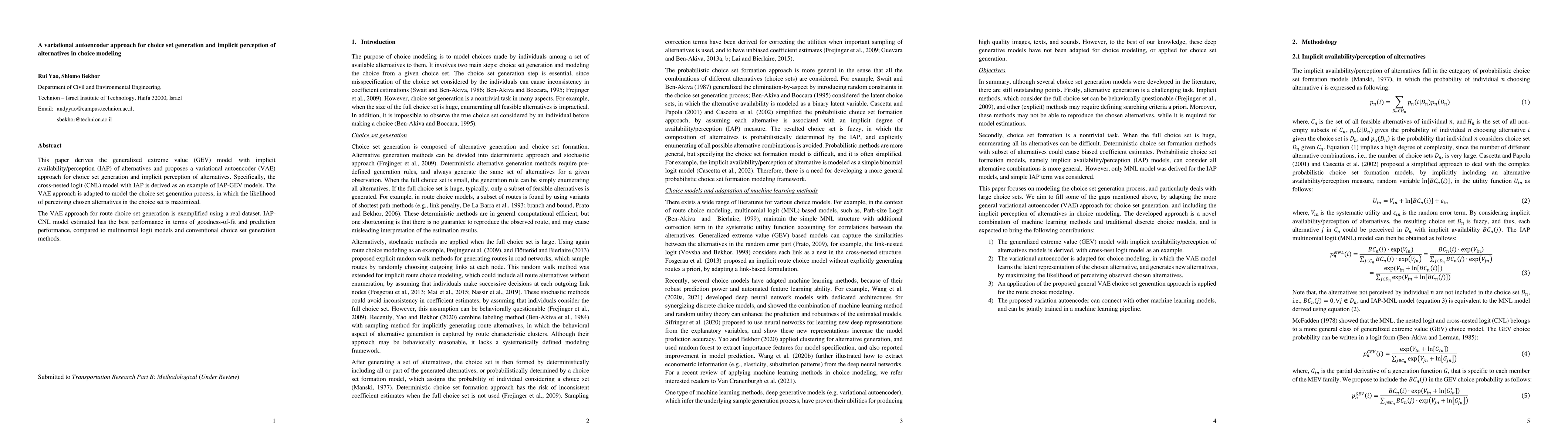 This paper proposes a variational autoencoder (VAE) approach to generate choice sets and model implicit perception of alternatives in choice modeling, specifically adapting it for the cross-nested logit (CNL) model with implicit availability/perception (IAP). The VAE method outperforms traditional models in terms of fit and predictive performance.