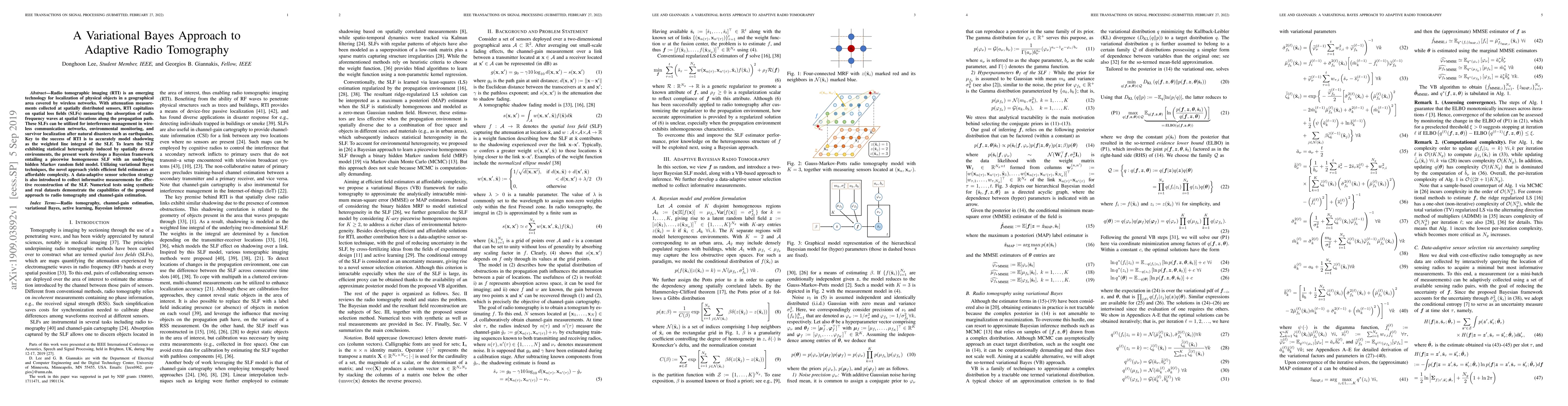 This paper proposes a variational Bayes method for adaptive radio tomographic imaging, utilizing a hidden Markov random field model to accurately model shadowing and spatial loss fields. The approach efficiently estimates these fields and includes a data-adaptive sensor selection strategy for effective reconstruction, validated through synthetic and real datasets.