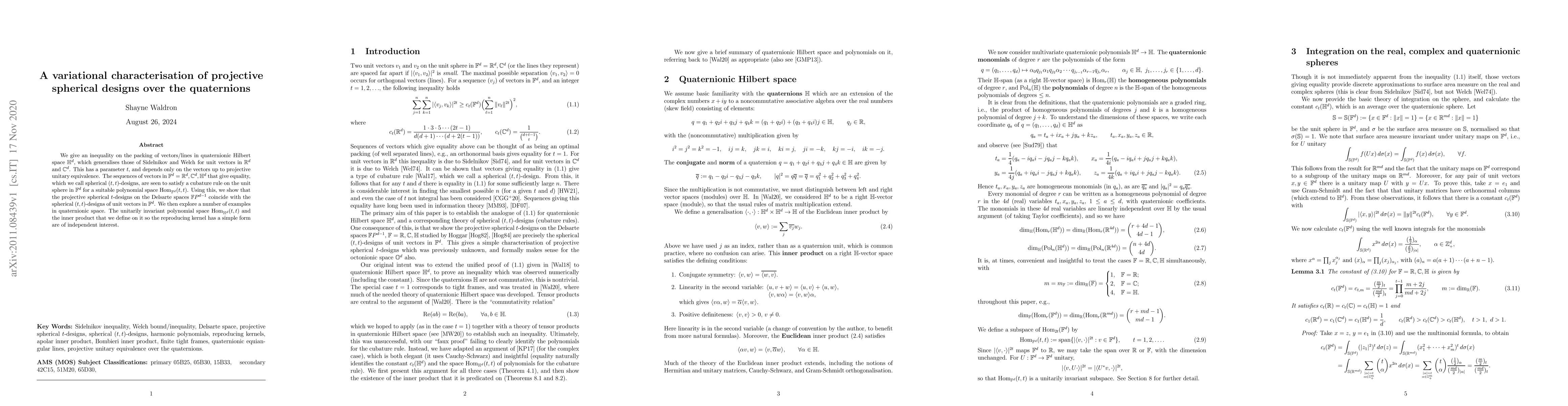 We give an inequality on the packing of vectors/lines in quaternionic Hilbert space $\Hd$, which generalises those of Sidelnikov and Welch for unit vectors in $\Rd$ and $\Cd$. This has a parameter $t$, and depends only on the vectors up to projective unitary equivalence. The sequences of vectors in ${\mathbb{F}}^d={\mathbb{R}}^d,{\mathbb{C}}^d,{\mathbb{H}}^d$ that give equality, which we call spherical $(t,t)$-designs, are seen to satisfy a cubature rule on the unit sphere in ${\mathbb{F}}^d$ for a suitable polynomial space $\Hom_{\Fd}(t,t)$. Using this, we show that the projective spherical $t$-designs on the Delsarte spaces $\FF P^{d-1}$ coincide with the spherical $(t,t)$-designs of unit vectors in ${\mathbb{F}}^d$. We then explore a number of examples in quaternionic space. The unitarily invariant polynomial space ${\mathop{\rm Hom}\nolimits}_{{\mathbb{H}}^d}(t,t)$ and the inner product that we define on it so the reproducing kernel has a simple form are of independent interest.