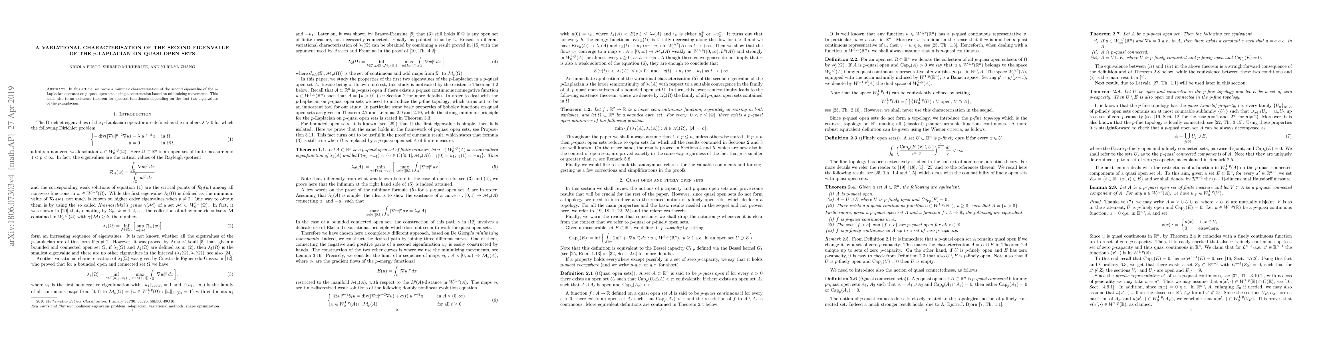 This paper establishes a variational characterization of the second eigenvalue of the p-Laplacian on quasi-open sets through a minimax approach, and proves an existence theorem for spectral functionals based on the first two eigenvalues.