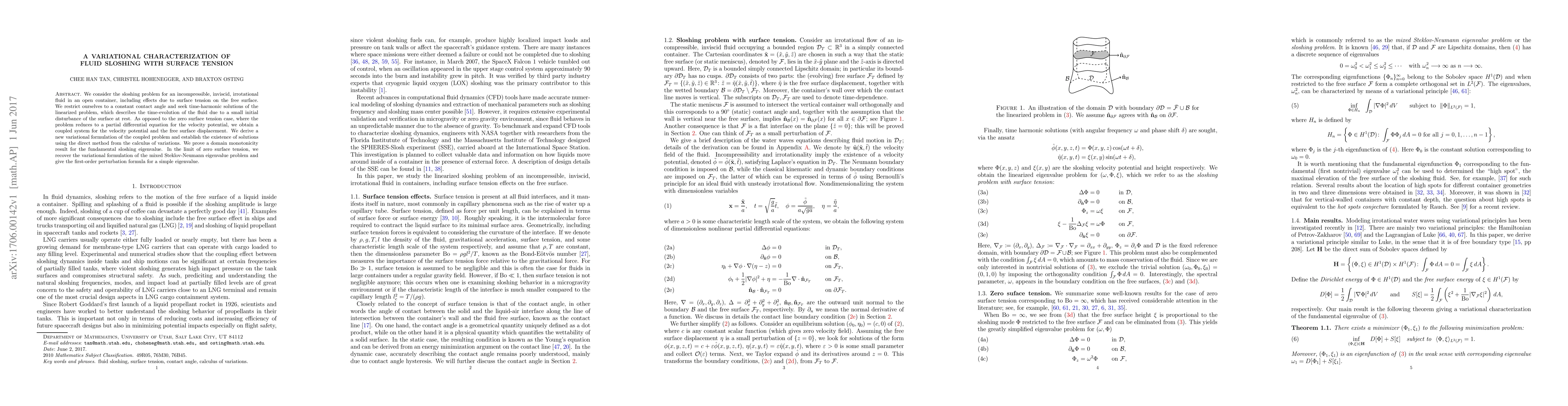 This paper develops a variational formulation for the sloshing problem of an incompressible fluid in an open container, incorporating surface tension effects. It establishes the existence of solutions using the calculus of variations and provides a perturbation formula for the fundamental sloshing eigenvalue in the limit of zero surface tension.