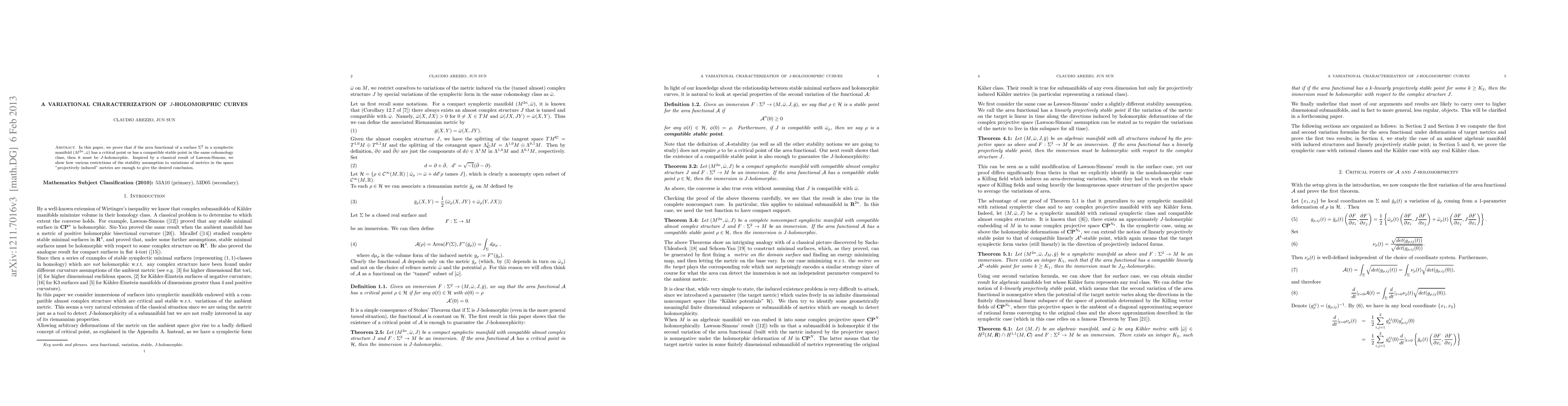 In this paper, we prove that if the area functional of a surface $\Sigma^2$ in a symplectic manifold $(M^{2n},\bar{\omega})$ has a critical point or has a compatible stable point in the same cohomology class, then it must be $J$-holomorphic. Inspired by a classical result of Lawson-Simons, we show how various restrictions of the stability assumption to variations of metrics in the space "projectively induced" metrics are enough to give the desired conclusion.