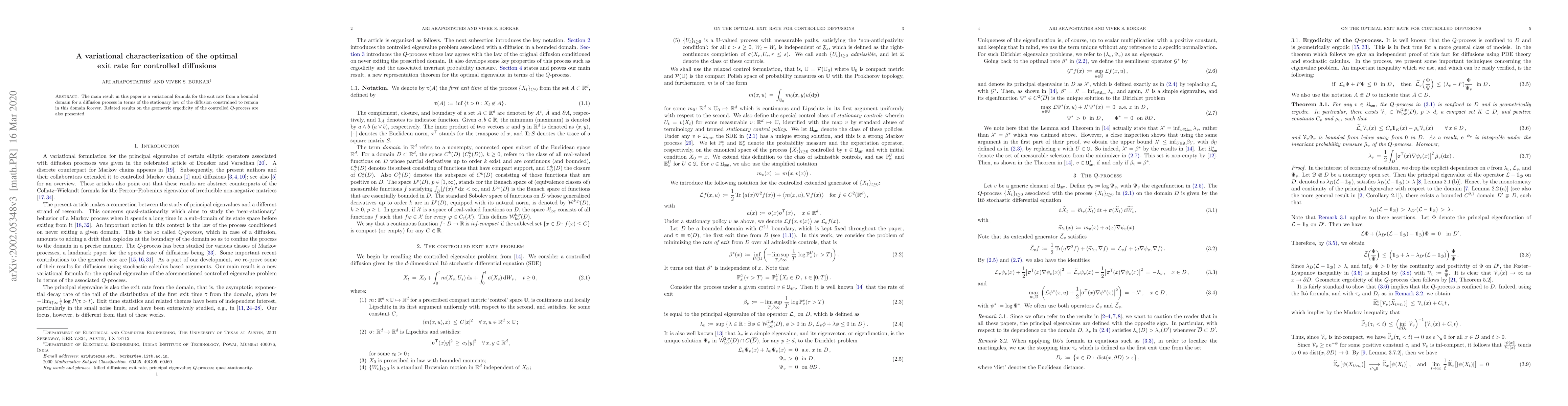 The main result in this paper is a variational formula for the exit rate from a bounded domain for a diffusion process in terms of the stationary law of the diffusion constrained to remain in this domain forever. Related results on the geometric ergodicity of the controlled Q-process are also presented.