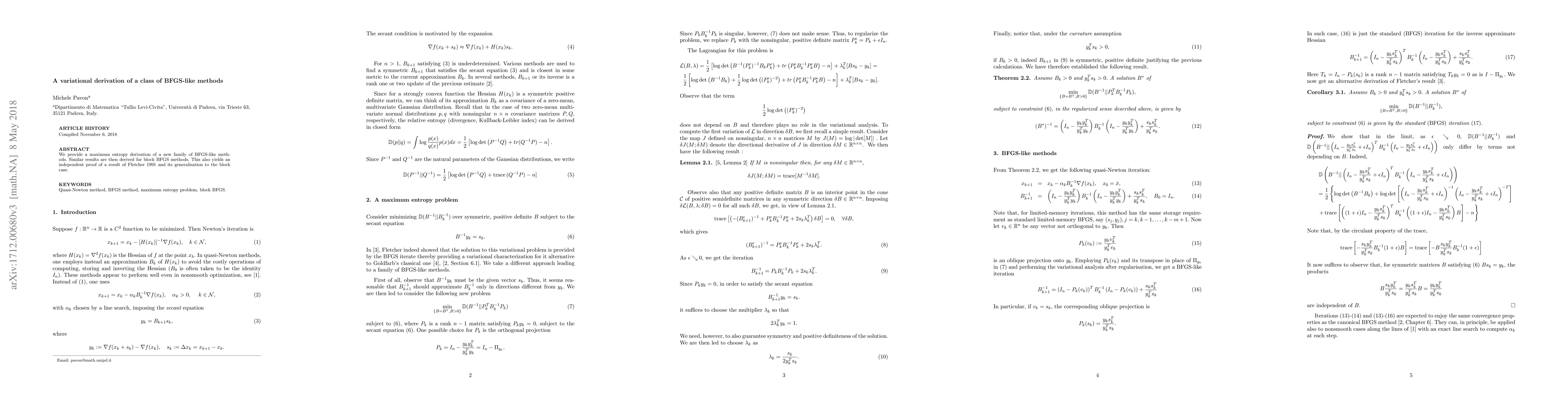 Summary: This paper presents a variational, maximum entropy derivation of a new class of BFGS-like optimization methods and extends the results to block BFGS methods, providing an independent proof of a generalized Fletcher result from 1991.
