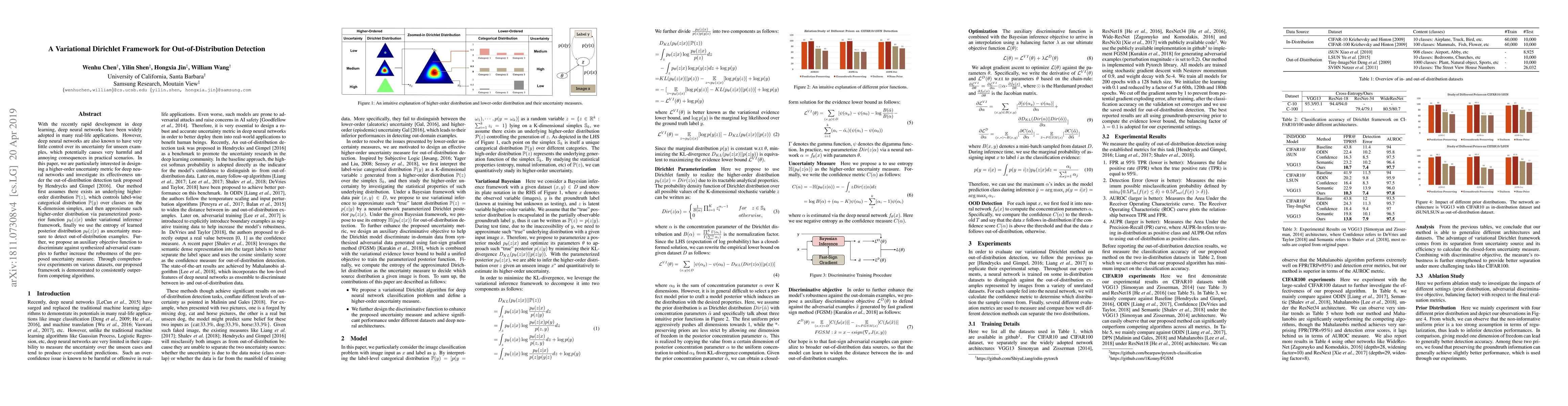 With the recently rapid development in deep learning, deep neural networks have been widely adopted in many real-life applications. However, deep neural networks are also known to have very little control over its uncertainty for unseen examples, which potentially causes very harmful and annoying consequences in practical scenarios. In this paper, we are particularly interested in designing a higher-order uncertainty metric for deep neural networks and investigate its effectiveness under the out-of-distribution detection task proposed by~\cite{hendrycks2016baseline}. Our method first assumes there exists an underlying higher-order distribution $\mathbb{P}(z)$, which controls label-wise categorical distribution $\mathbb{P}(y)$ over classes on the K-dimension simplex, and then approximate such higher-order distribution via parameterized posterior function $p_{\theta}(z|x)$ under variational inference framework, finally we use the entropy of learned posterior distribution $p_{\theta}(z|x)$ as uncertainty measure to detect out-of-distribution examples. Further, we propose an auxiliary objective function to discriminate against synthesized adversarial examples to further increase the robustness of the proposed uncertainty measure. Through comprehensive experiments on various datasets, our proposed framework is demonstrated to consistently outperform competing algorithms.