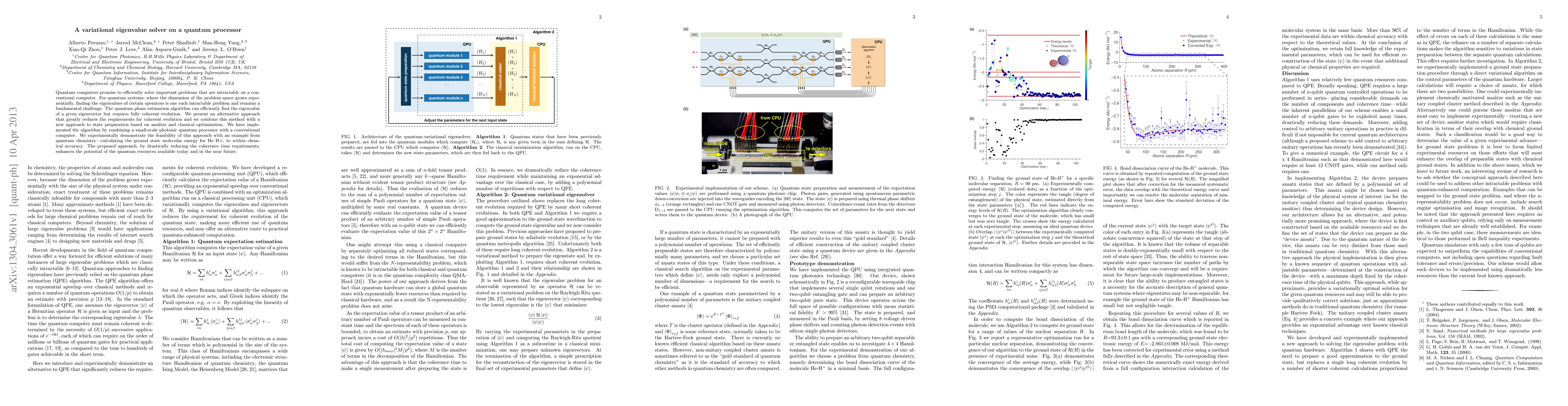 The research presents a variational eigenvalue solver implemented on a small-scale photonic quantum processor combined with a conventional computer, demonstrating its feasibility by calculating the ground state molecular energy for He-H+ to within chemical accuracy.