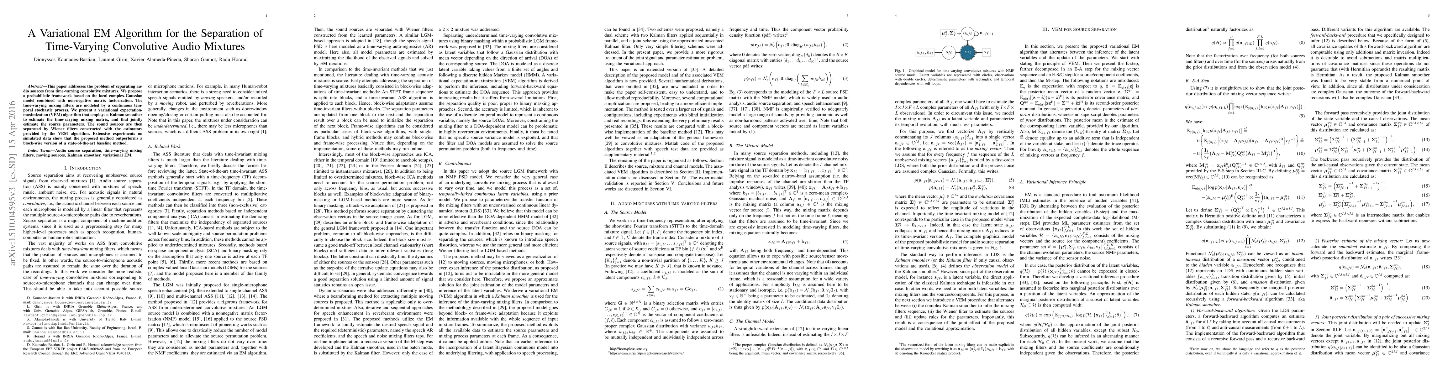 This paper proposes a variational EM algorithm for separating time-varying convolutive audio mixtures using a local complex-Gaussian model and non-negative matrix factorization. The method employs a Kalman smoother to estimate time-varying mixing filters and separates sources via Wiener filters, outperforming a block-wise baseline in experiments.