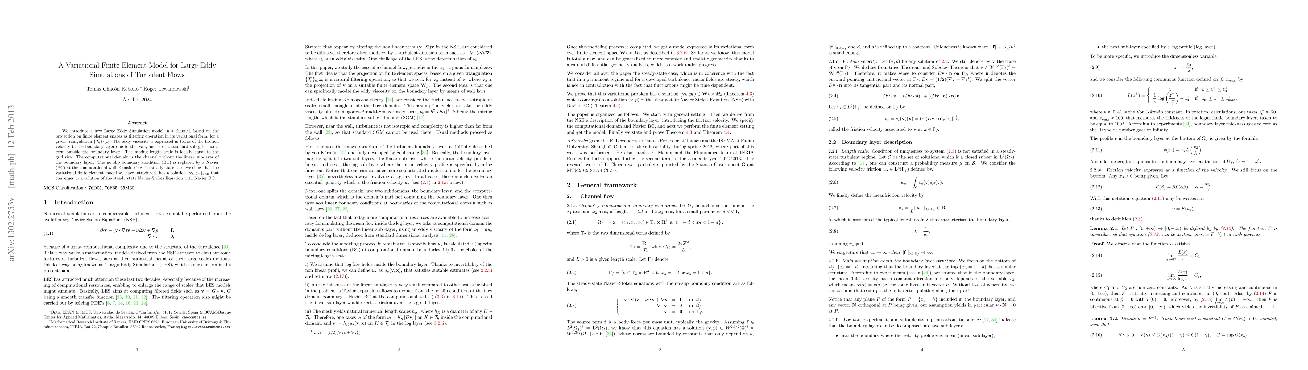This paper presents a variational finite element model for Large Eddy Simulations of turbulent flows in a channel, utilizing projection on finite element spaces for filtering. The model converges to a steady-state Navier-Stokes solution with Navier boundary conditions, replacing the no-slip condition.