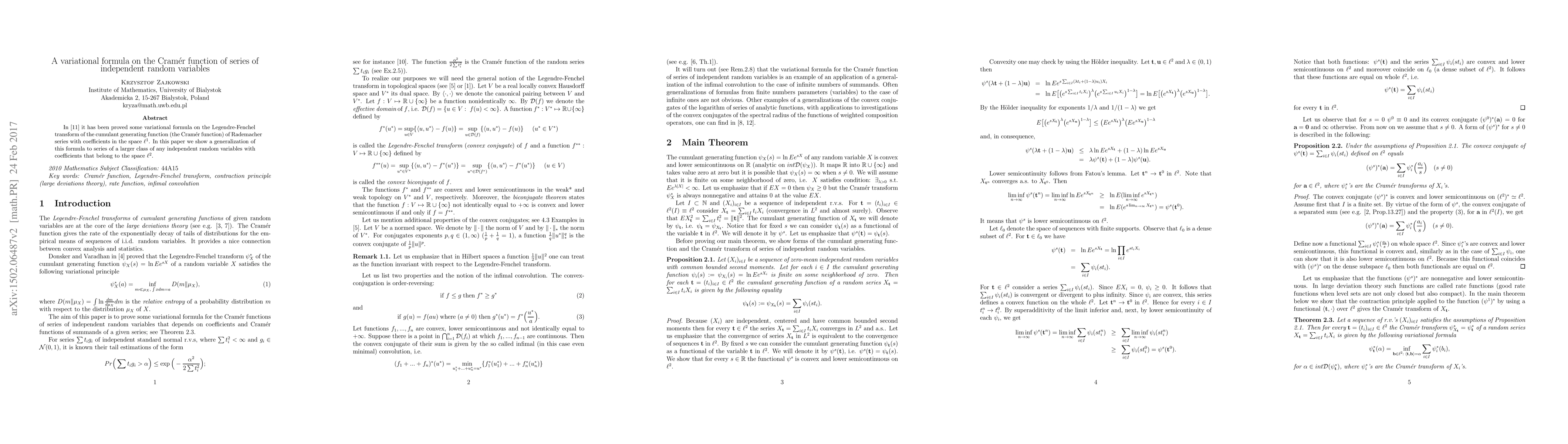 In [11] it has been proved some variational formula on the Legendre-Fenchel transform of the cumulant generating function (the Cram\'er function) of Rademacher series with coefficients in the space $\ell^1$. In this paper we show a generalization of this formula to series of a larger class of any independent random variables with coefficients that belong to the space $\ell^2$.