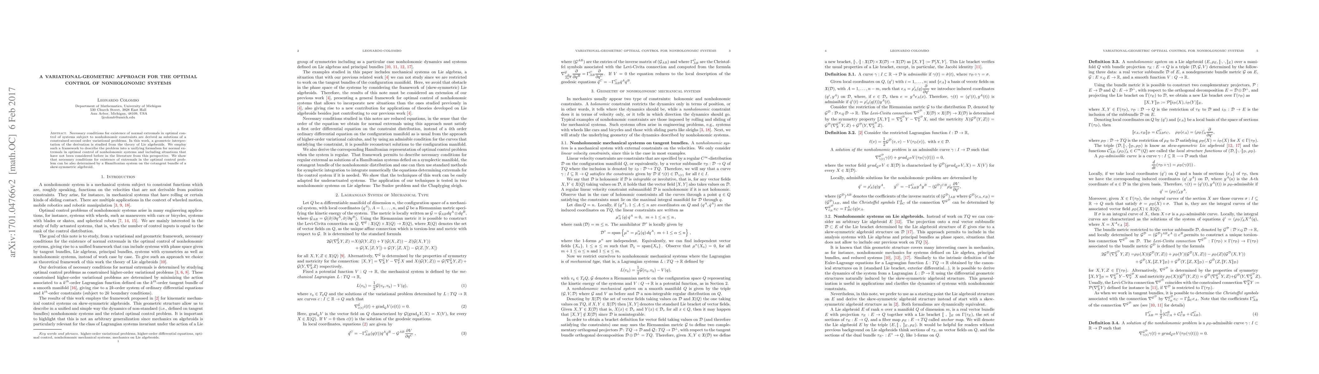 This paper derives necessary conditions for optimal control of nonholonomic systems using variational-geometric methods, interpreting the derivation through Lie algebroids. It presents a unifying formalism for normal extremals and extends the analysis to previously unconsidered scenarios, showing that extremals' existence can be determined via a Hamiltonian system on the cotangent bundle of a skew-symmetric algebroid.