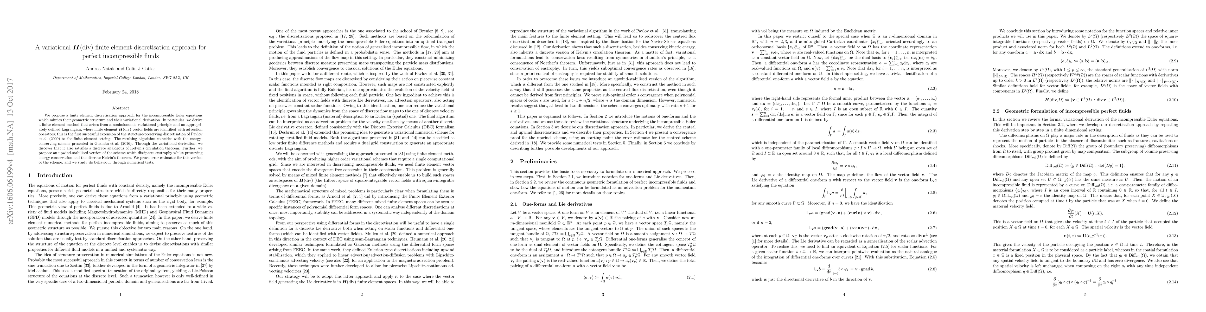 This paper proposes a variational H(div) finite element method for simulating perfect incompressible fluids, extending previous structure-preserving discretisations. It maintains energy conservation and satisfies a discrete Kelvin's circulation theorem, with an upwind-stabilised variant that dissipates enstrophy while preserving these properties, supported by error estimates and numerical tests.