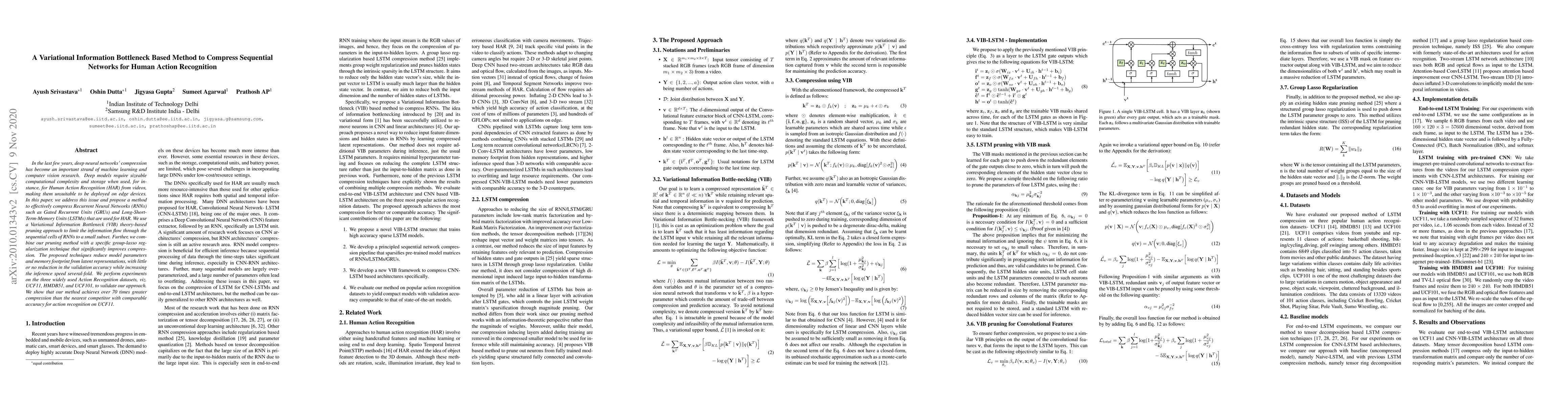 In the last few years, compression of deep neural networks has become an important strand of machine learning and computer vision research. Deep models require sizeable computational complexity and storage, when used for instance for Human Action Recognition (HAR) from videos, making them unsuitable to be deployed on edge devices. In this paper, we address this issue and propose a method to effectively compress Recurrent Neural Networks (RNNs) such as Gated Recurrent Units (GRUs) and Long-Short-Term-Memory Units (LSTMs) that are used for HAR. We use a Variational Information Bottleneck (VIB) theory-based pruning approach to limit the information flow through the sequential cells of RNNs to a small subset. Further, we combine our pruning method with a specific group-lasso regularization technique that significantly improves compression. The proposed techniques reduce model parameters and memory footprint from latent representations, with little or no reduction in the validation accuracy while increasing the inference speed several-fold. We perform experiments on the three widely used Action Recognition datasets, viz. UCF11, HMDB51, and UCF101, to validate our approach. It is shown that our method achieves over 70 times greater compression than the nearest competitor with comparable accuracy for the task of action recognition on UCF11.