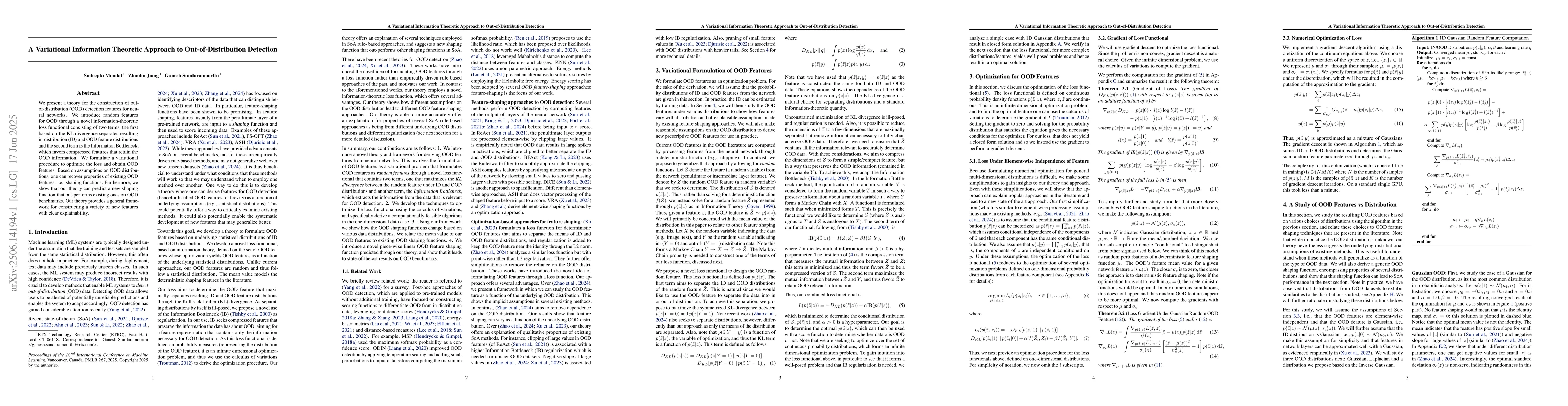 We present a theory for the construction of out-of-distribution (OOD) detection features for neural networks. We introduce random features for OOD through a novel information-theoretic loss functional consisting of two terms, the first based on the KL divergence separates resulting in-distribution (ID) and OOD feature distributions and the second term is the Information Bottleneck, which favors compressed features that retain the OOD information. We formulate a variational procedure to optimize the loss and obtain OOD features. Based on assumptions on OOD distributions, one can recover properties of existing OOD features, i.e., shaping functions. Furthermore, we show that our theory can predict a new shaping function that out-performs existing ones on OOD benchmarks. Our theory provides a general framework for constructing a variety of new features with clear explainability.