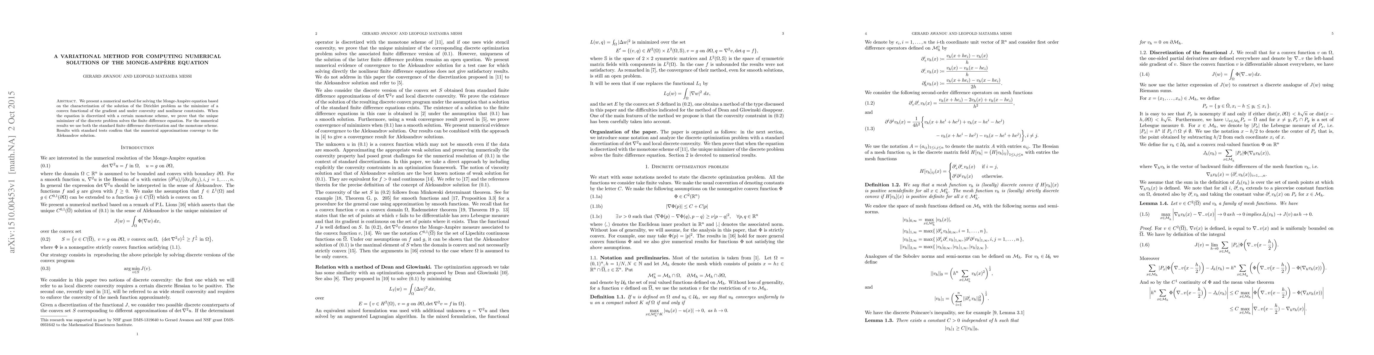 This paper introduces a variational method for solving the Monge-Ampere equation, proving that the discretized problem's unique minimizer satisfies the finite difference equation. Numerical results show convergence to the Aleksandrov solution using standard finite difference and monotone schemes.