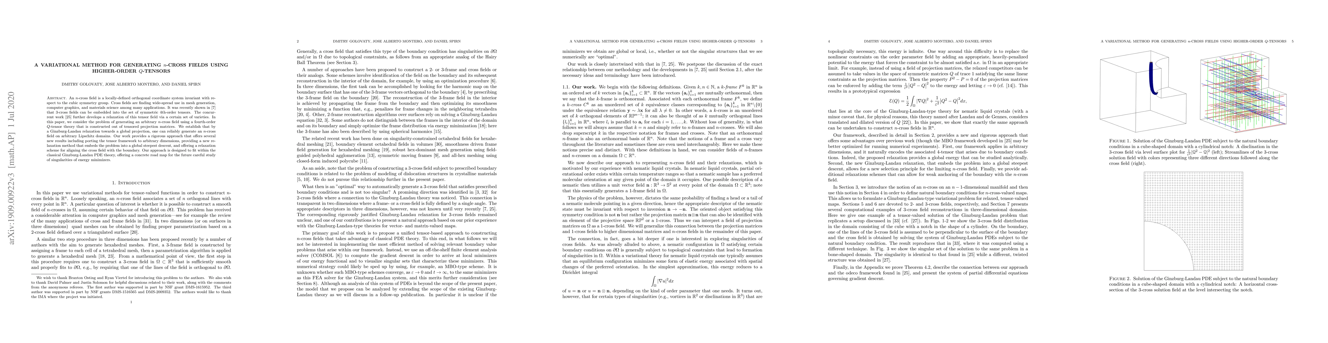 An $n$-cross field is a locally-defined orthogonal coordinate system invariant with respect to the cubic symmetry group. Cross fields are finding wide-spread use in mesh generation, computer graphics, and materials science among many applications. It was recently by other authors that $3$-cross fields can be embedded into the set of symmetric $4$th-order tensors. Another concurrent work further develops a relaxation of this tensor field via a certain set of varieties. In this paper, we consider the problem of generating an arbitrary $n$-cross field using a fourth-order $Q$-tensor theory that is constructed out of tensored projection matrices. We establish that by a Ginzburg-Landau relaxation towards a global projection, one can reliably generate an $n$-cross field on arbitrary Lipschitz domains. Our work provides a rigorous approach that offers several new results including porting the tensor framework to arbitrary dimensions, providing a new relaxation method that embeds the problem into a global steepest descent, and offering a relaxation scheme for aligning the cross field with the boundary. Our approach is designed to fit within the classical Ginzburg-Landau PDE theory, offering a concrete road map for the future careful study of singularities of energy minimizers.
