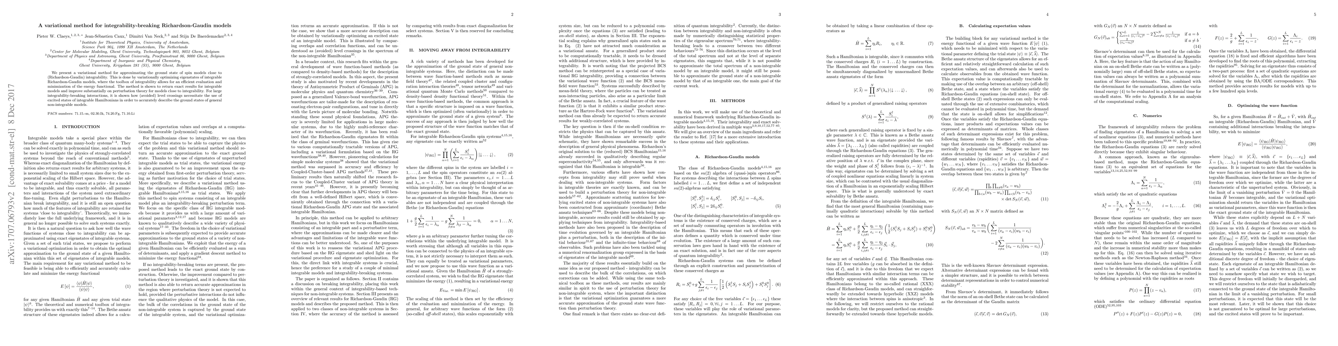 This paper introduces a variational method to approximate the ground state of spin models near integrability by optimizing eigenstates of integrable Richardson-Gaudin models, demonstrating exact results for integrable cases and significant improvements over perturbation theory for near-integrable models. For strong integrability-breaking interactions, it highlights the necessity of using excited states to accurately describe non-integrable ground states.
