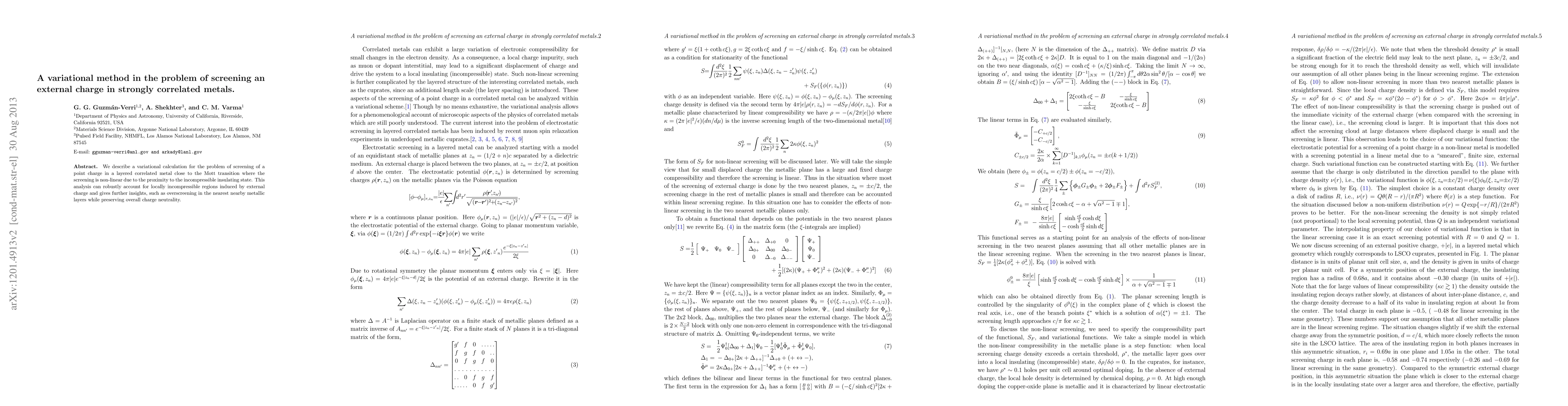We describe a variational calculation for the problem of screening of a point charge in a layered correlated metal for dopings close to the Mott transition where the screening is non-linear due to the proximity to the incompressible insulating state. We find that external charge can induce locally incompressible regions and that the non-linear dependence of the screening on density can induce overscreening in the nearest nearby layers while preserving overall charge neutrality.