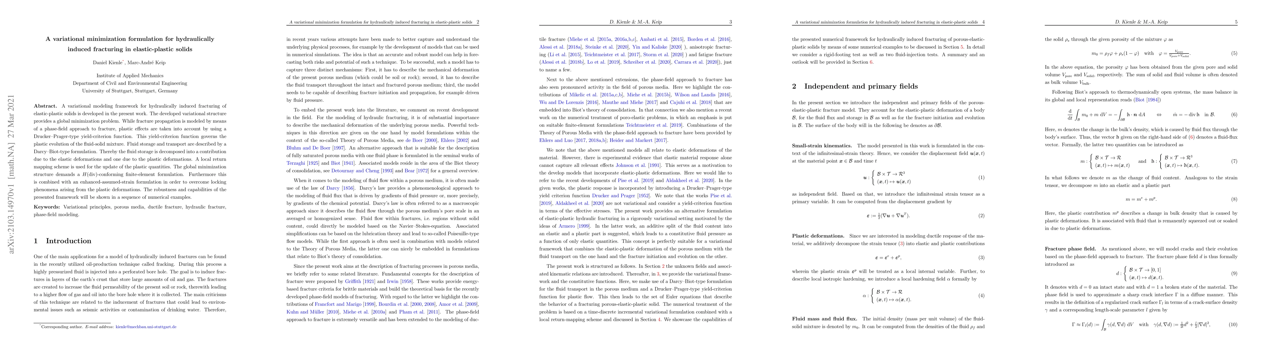 This paper presents a variational modeling framework for hydraulically induced fracturing in elastic-plastic solids, utilizing a phase-field approach for fracture propagation and a Drucker-Prager yield criterion for plastic effects. The framework employs a Darcy-Biot formulation for fluid storage and transport, and an enhanced-assumed-strain method to mitigate locking phenomena.