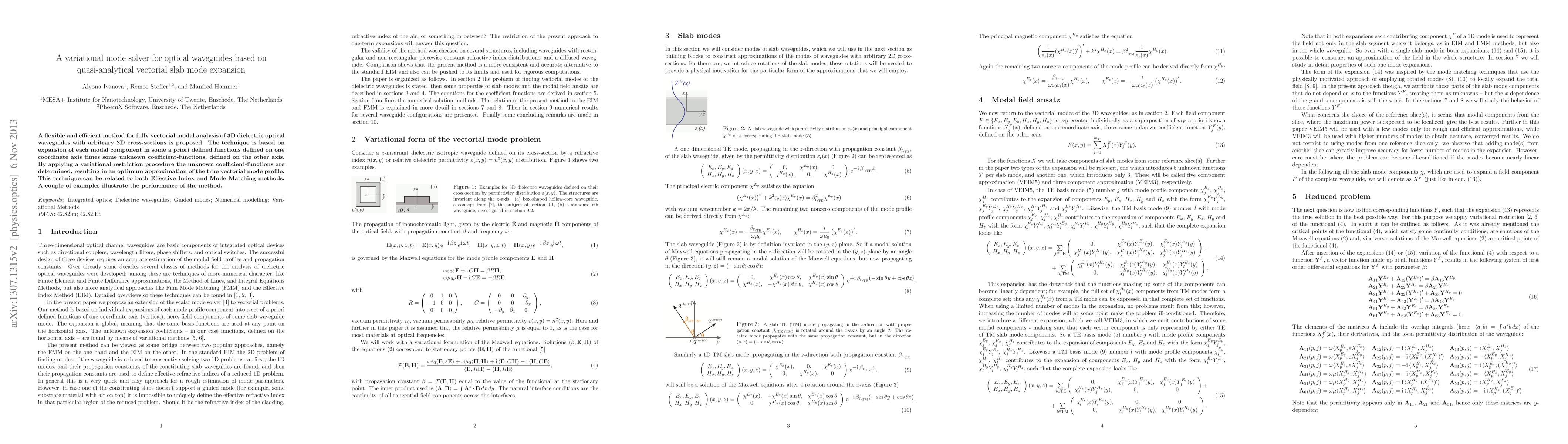 This paper proposes a variational mode solver for 3D dielectric optical waveguides using quasi-analytical vectorial slab mode expansion, achieving efficient and accurate vectorial modal analysis for arbitrary 2D cross-sections. The method optimizes mode profiles through a variational restriction procedure, demonstrating performance through illustrative examples.